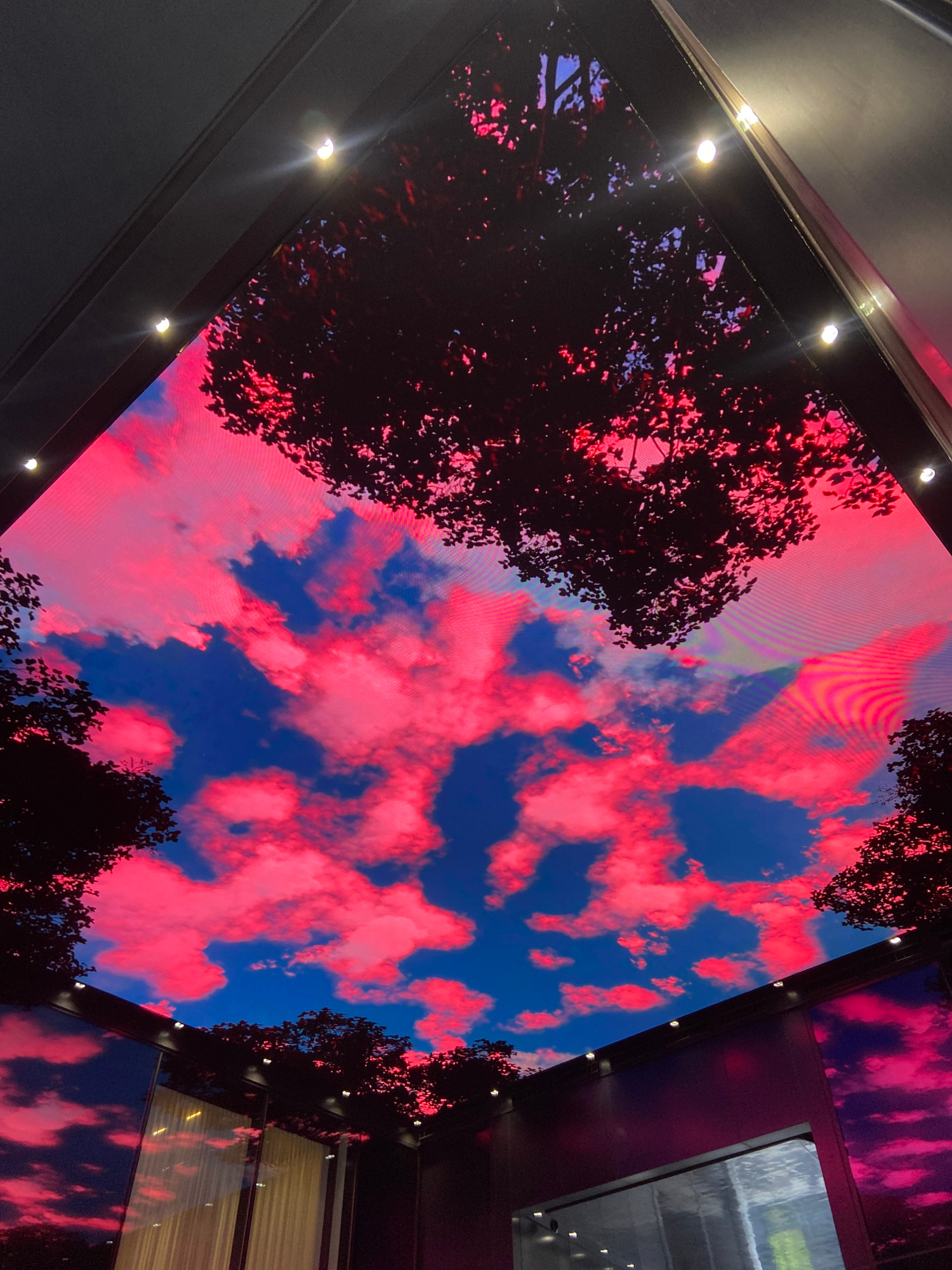 This is an eye-level shot of a large, square display screen, likely an LED panel, integrated into a modern ceiling or canopy structure. The display shows a vibrant and dramatic scene of a blue sky fil…read more