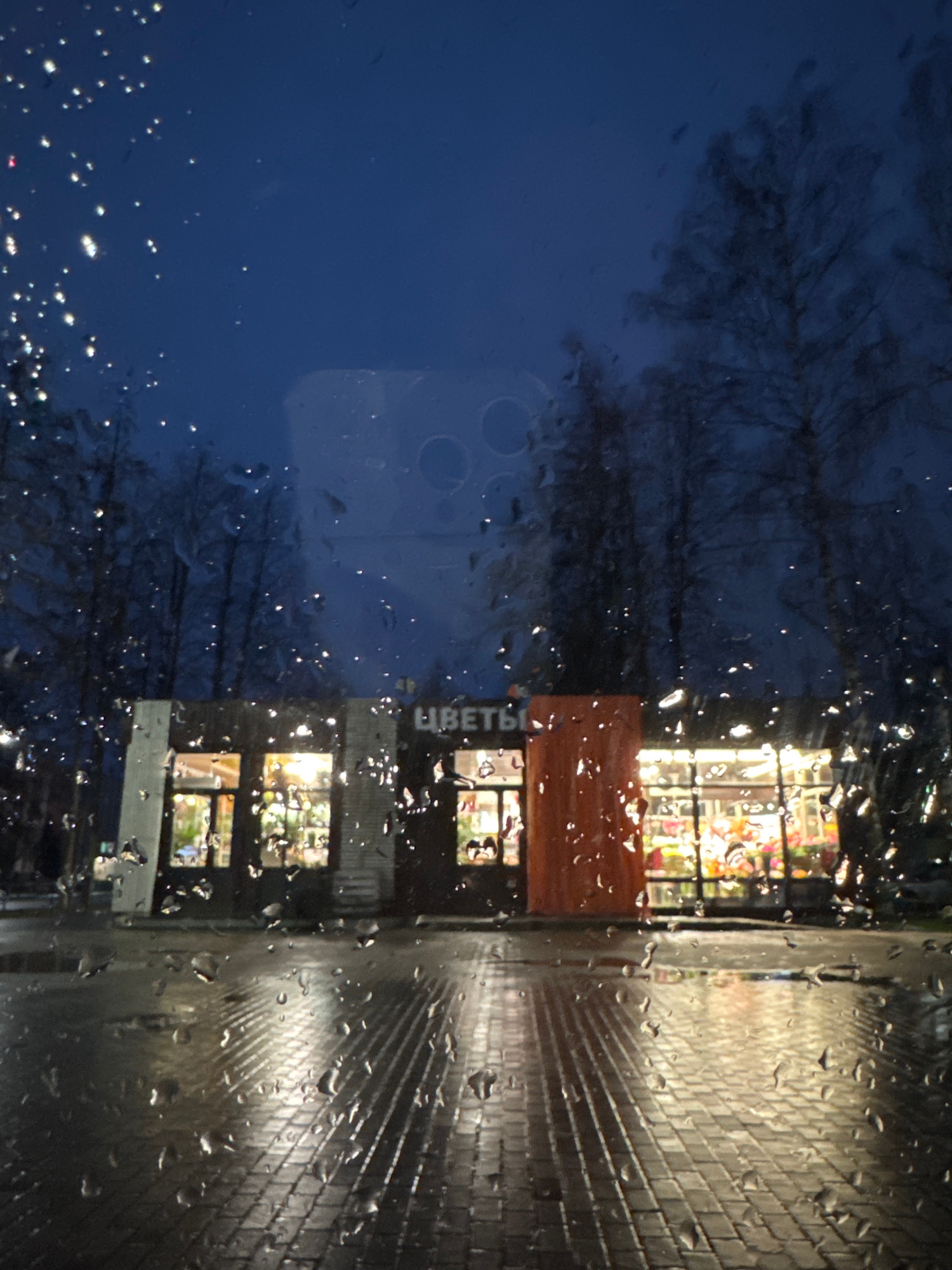 A view through a rain-streaked window shows a building in Chaikovsky, Russia. The sign on the building reads "ЦВЕТЫ" ("Flowers"). The building is likely a flower shop. The view outside the window incl…read more