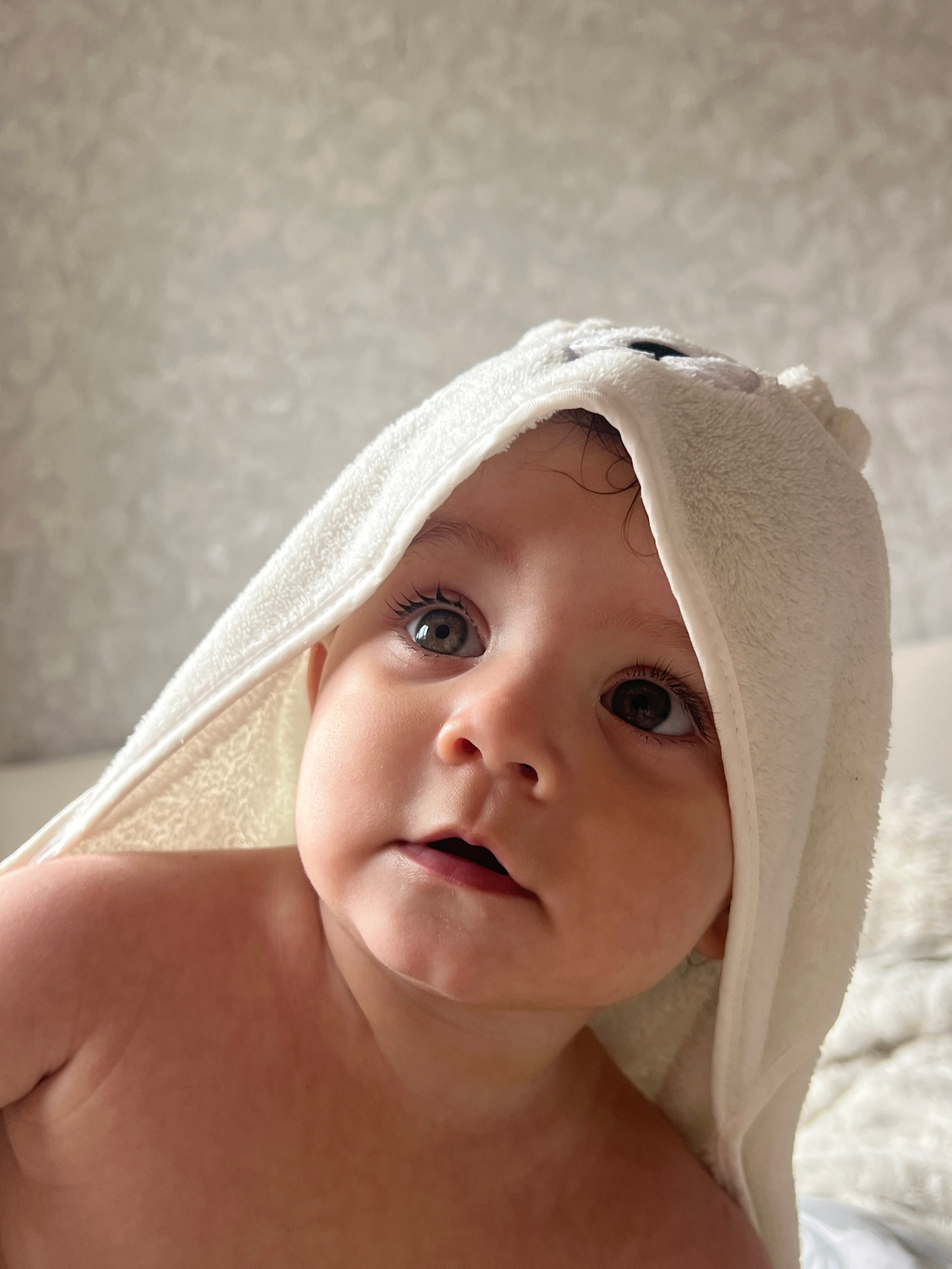 A close-up, tilted shot shows a baby wearing a white hooded towel. The baby's face is the primary subject, featuring large, expressive eyes and a slightly open mouth. The towel is positioned around th…read more