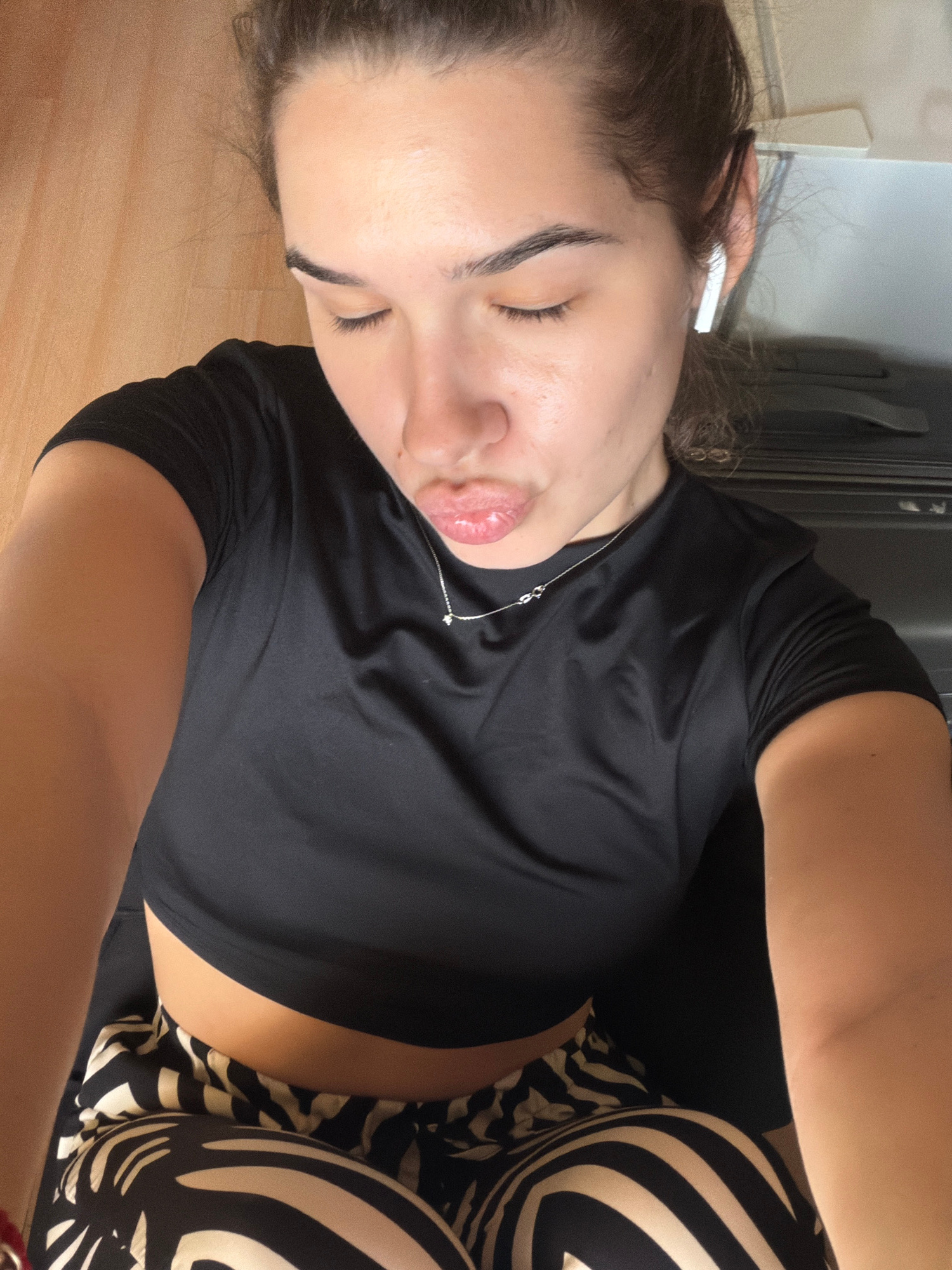 A woman is pictured indoors from a close, high-angle perspective. She has light skin and dark hair pulled back, and her eyes are closed. She wears a black short-sleeved shirt and zebra-striped bottoms…read more