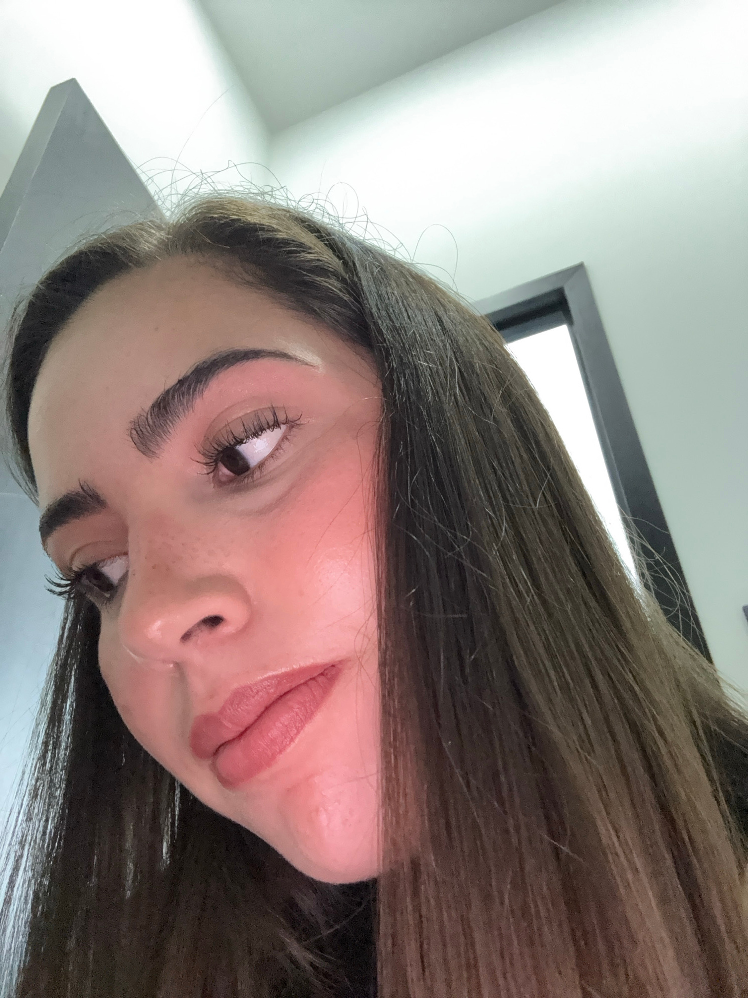 The image shows a close-up view of a person's face and hair, tilted to the side. The person has brown hair, fair skin, and prominent eyebrows. Freckles are visible on the nose. The person is wearing l…read more
