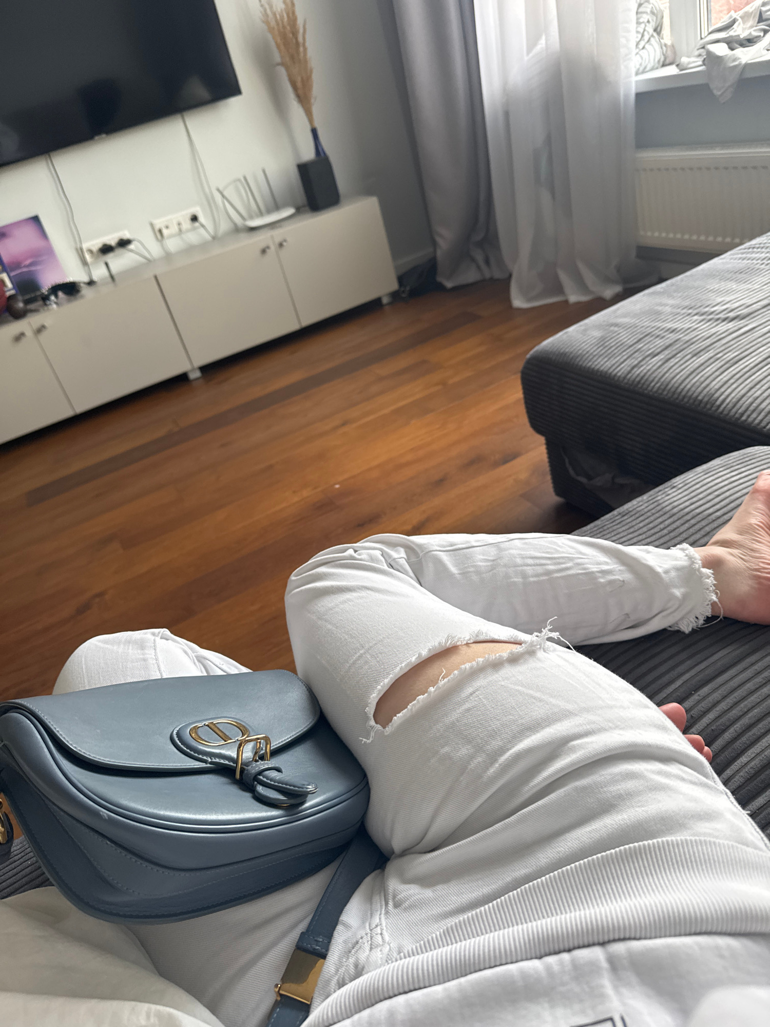 A first-person perspective photograph shows a person sitting on a gray couch in an indoor setting. The individual is wearing white ripped jeans and a white shirt. A blue purse with a gold clasp is res…read more