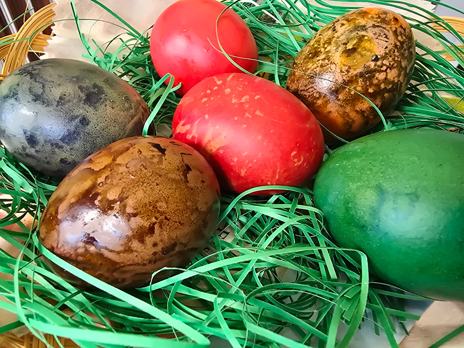 A high-angle, close-up shot depicts six decorated Easter eggs nestled among green paper Easter grass in a woven basket. The eggs are colored red (2), brown, dark brown, green, and a brownish-yellow eg…read more