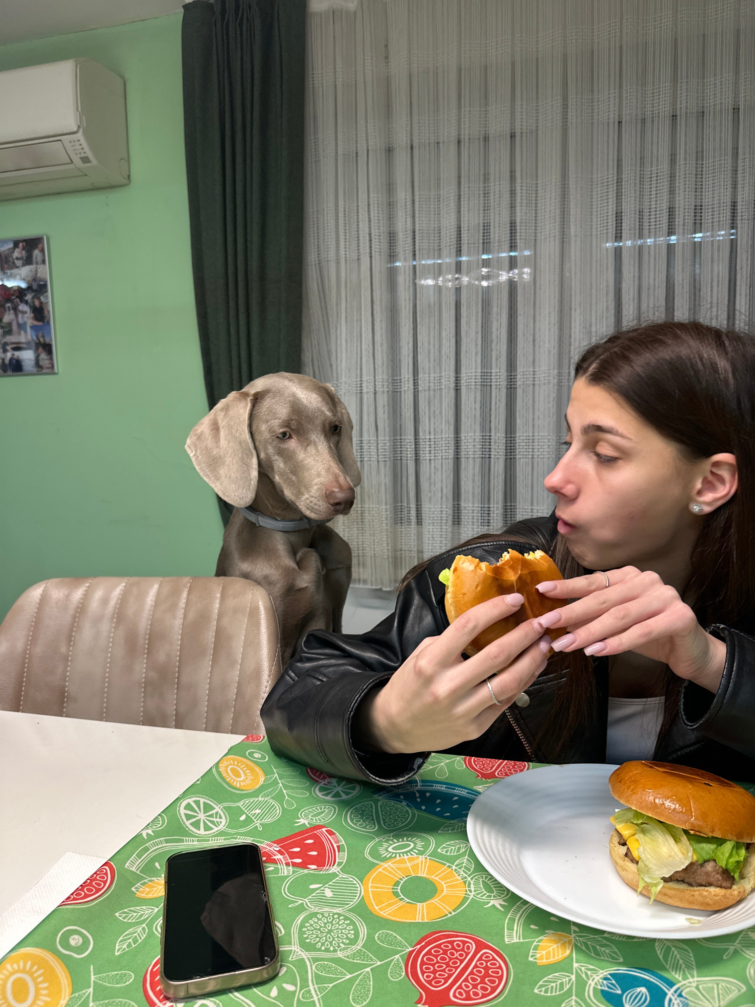 A young woman with long brown hair wearing a black leather jacket is eating a hamburger indoors. She is seated at a table covered with a green tablecloth patterned with colorful fruits. There is anoth…read more