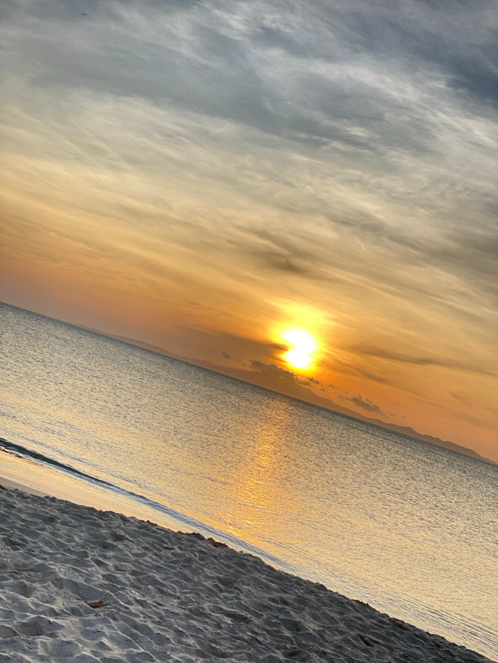 A rotated seascape image shows a beach where sunlight reflects off the water, creating a bright streak. The beach sand is textured. The sky transitions from gray-white clouds to a golden hue near the…read more