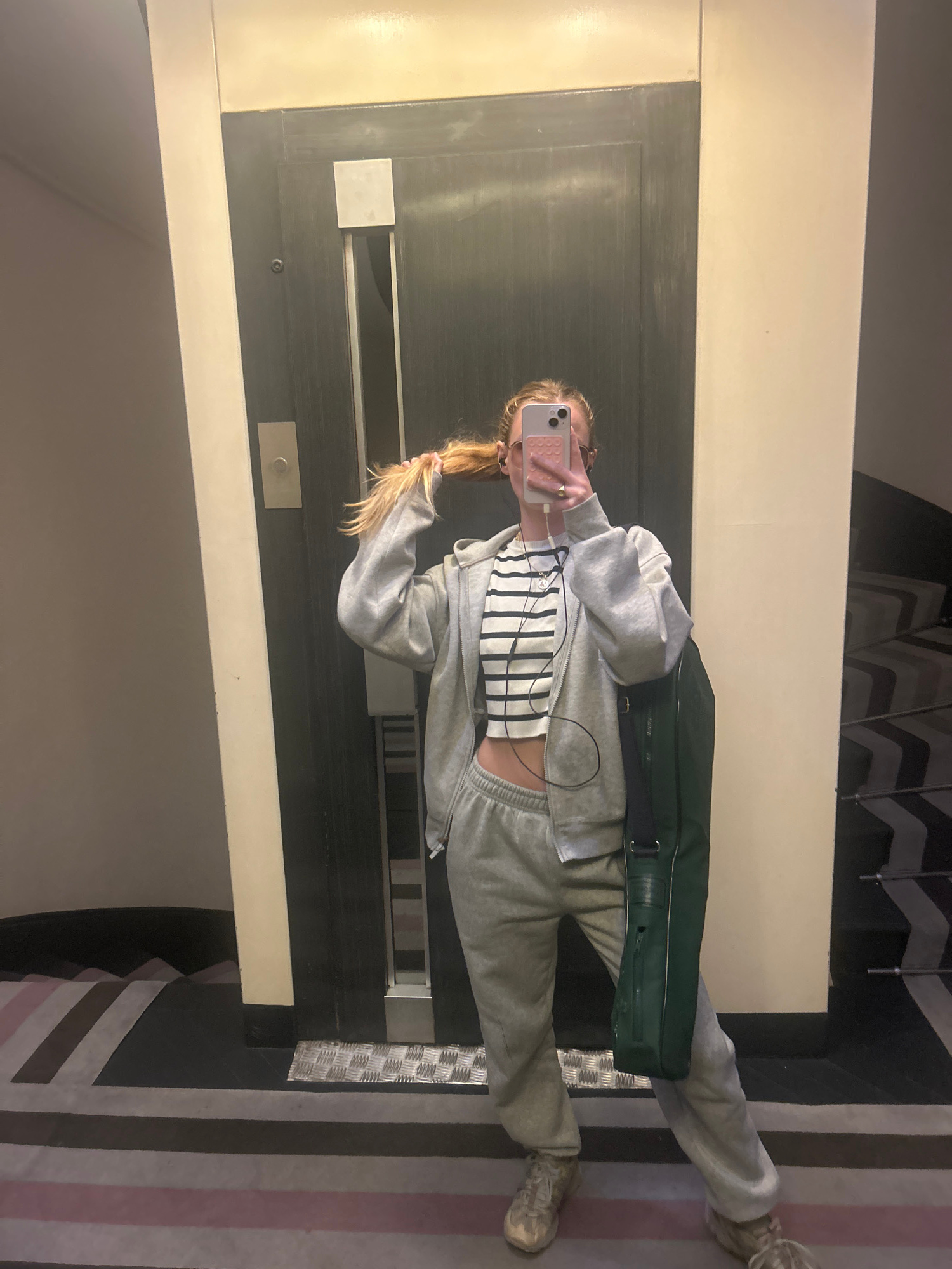 A person is taking a mirror selfie. The person has blond hair pulled back in a ponytail, and is wearing a gray sweat suit with a black and white striped top. The person is holding a pink phone. A darkβ¦read more