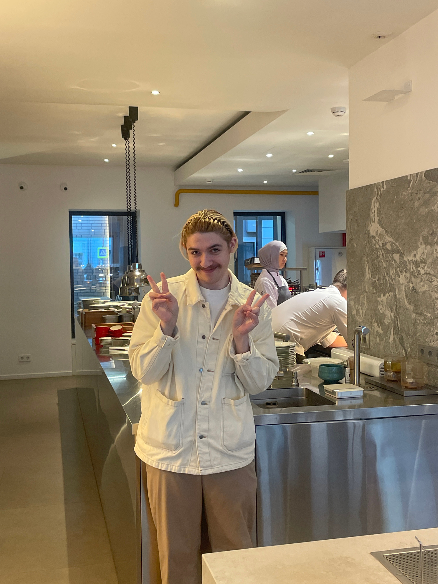 A young person is standing in what appears to be a restaurant kitchen. They are wearing tan pants, a white t-shirt, and a white denim jacket, and they are holding up two fingers in a peace sign with b…read more