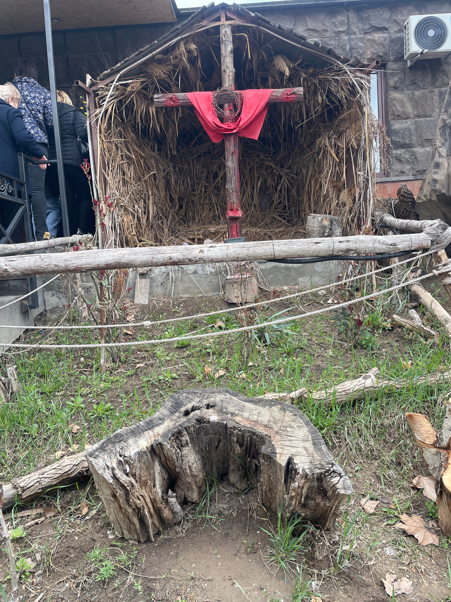 The image shows an outdoor scene in Yerevan, Armenia, featuring a rustic, hut-like structure built against a stone building. Inside the structure, a wooden cross is prominently displayed, draped with…read more