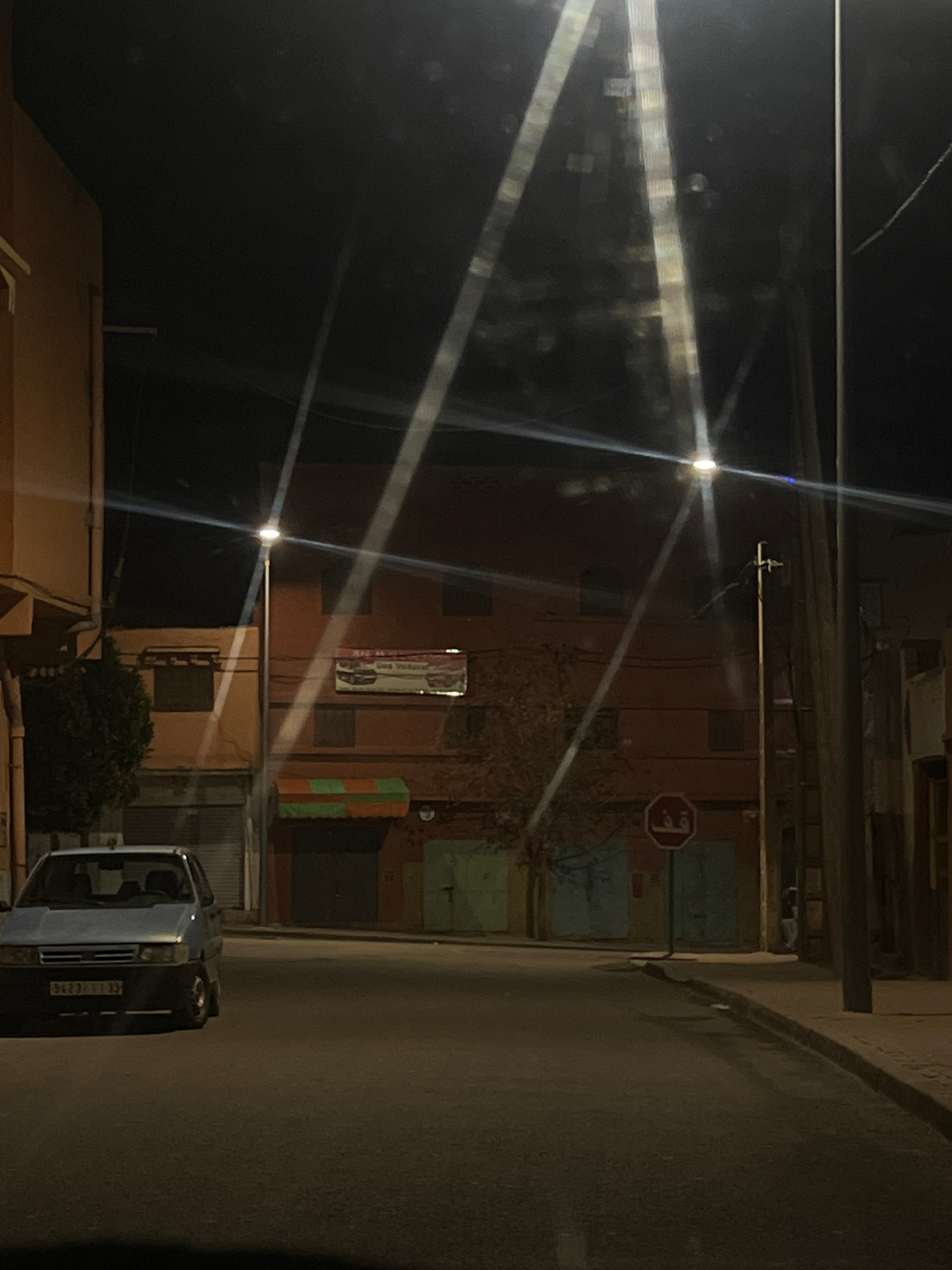 An outdoor nighttime view of an alley in the Moroccan city of Ouaouizert. Streetlights cast a hazy glow. A building facade is visible with rectangular windows and a vertical poster. A bush grows at thβ¦read more