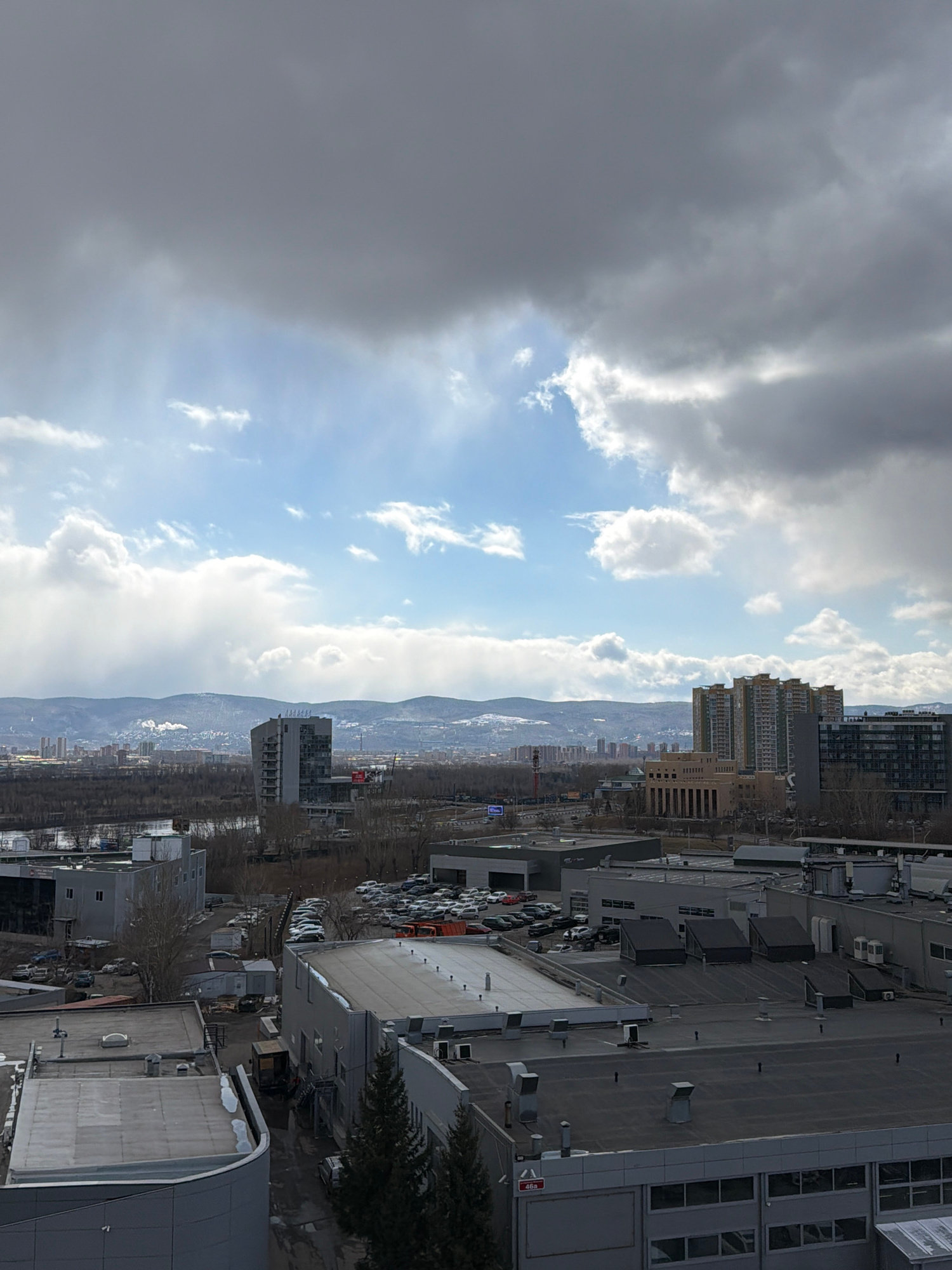 The image depicts an elevated view of Krasnoyarsk, Russia. The sky dominates the left side, with dark storm clouds contrasting with patches of blue sky and white cumulus clouds. The city stretches out…read more