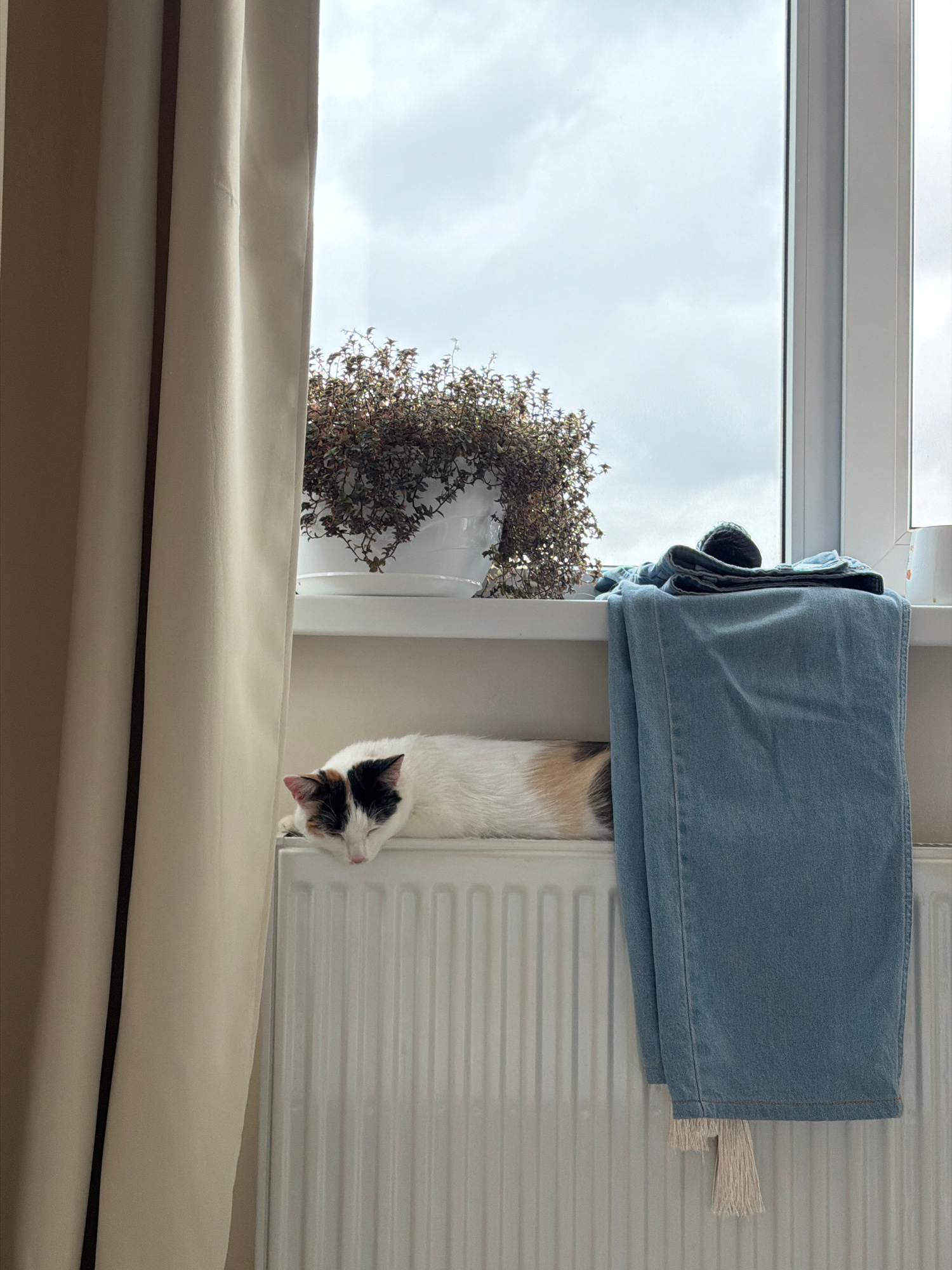 A cat is sitting on a radiator underneath a pair of jeans on a window sill in a room. The radiator is white and has vertical lines. The jeans are light blue. The cat is mostly white with patches of bl…read more