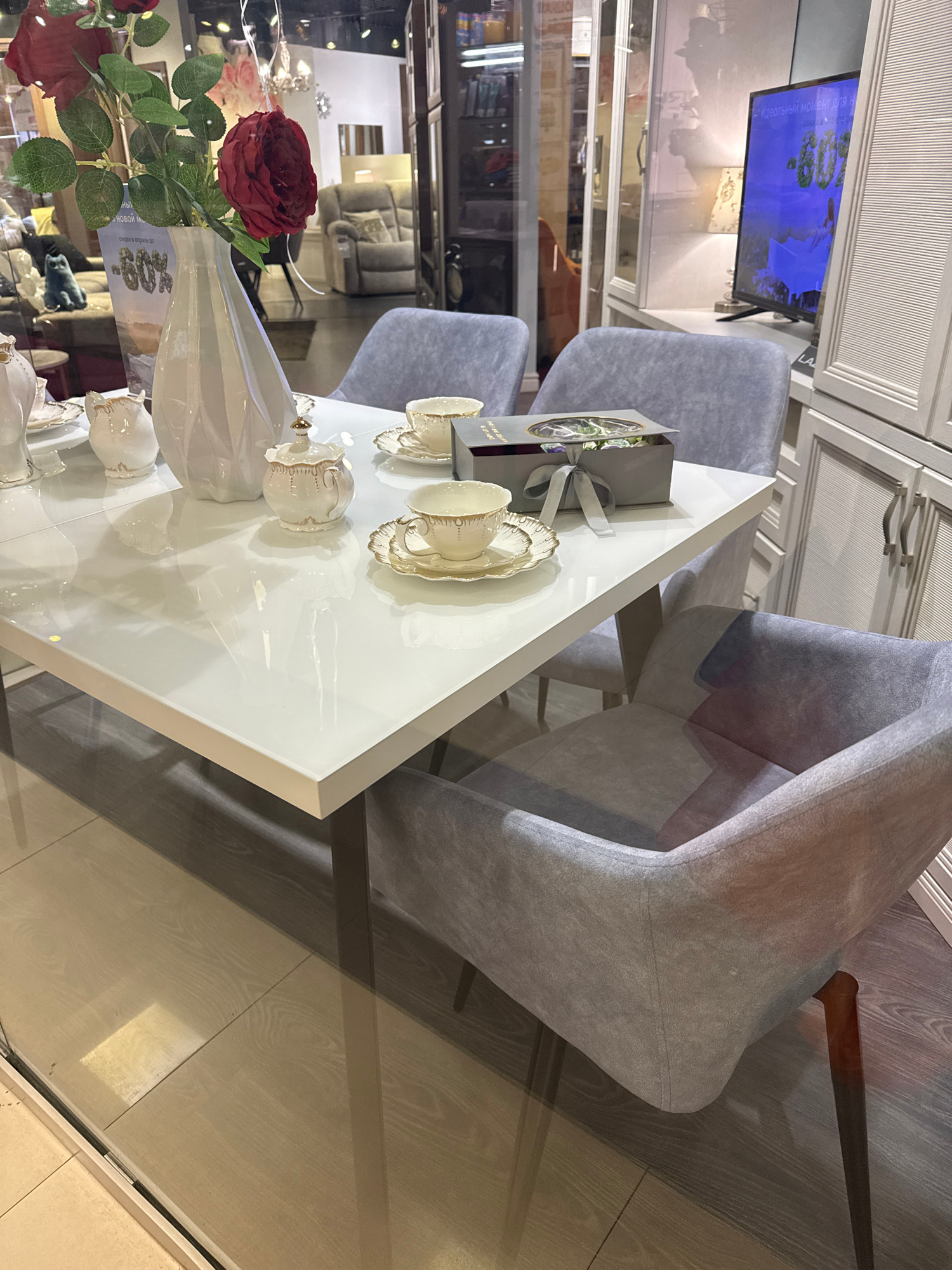 The image shows a display in Dmitrov, Russia, likely within a furniture or home decor store. A white, square table is set with fine porcelain teacups, saucers, and a creamer. A tall, white vase contai…read more