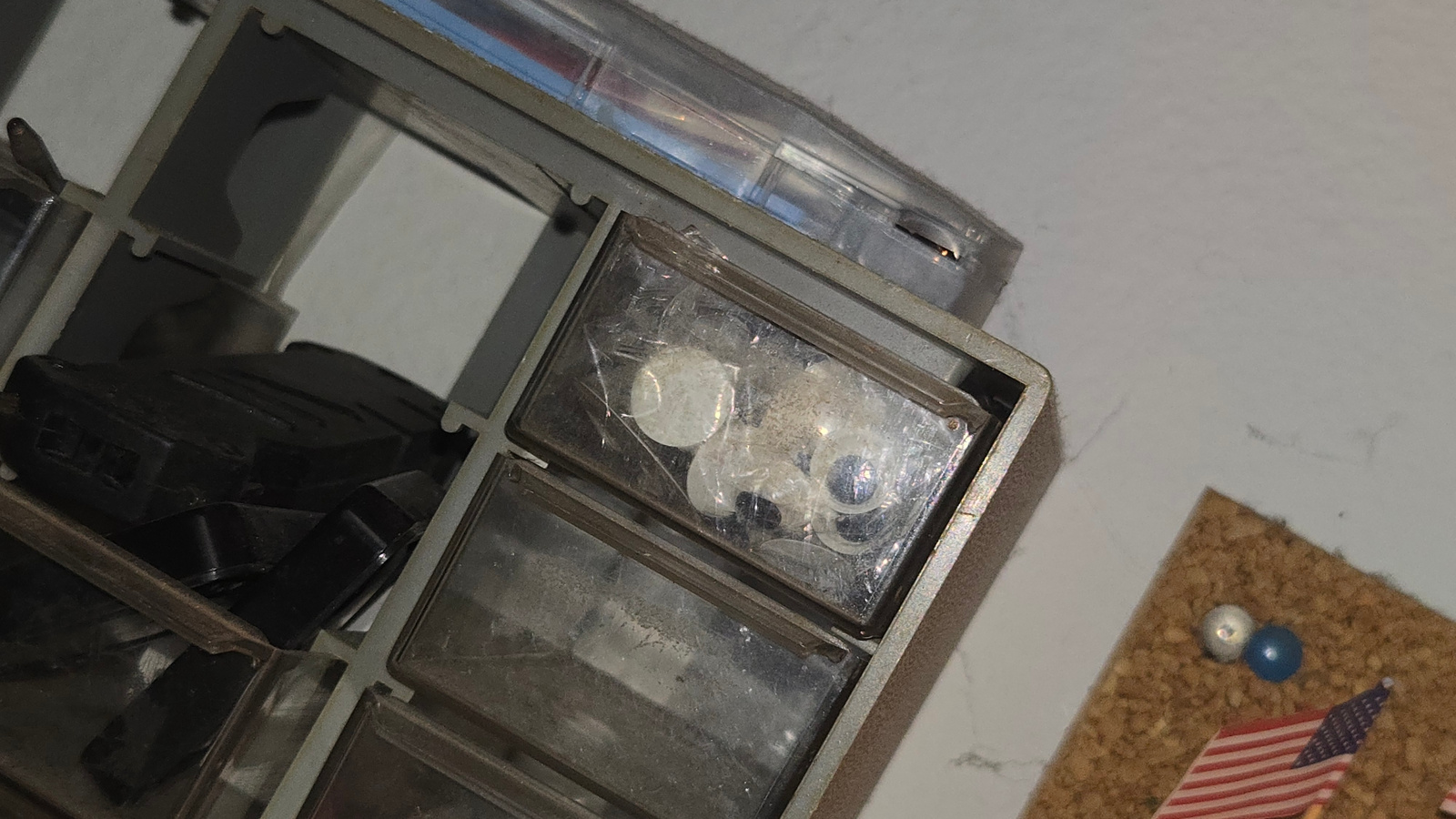 The image shows a section of a grey plastic storage box with multiple compartments. One compartment contains several white, round objects that appear to be lenses or small discs, some possibly package…read more