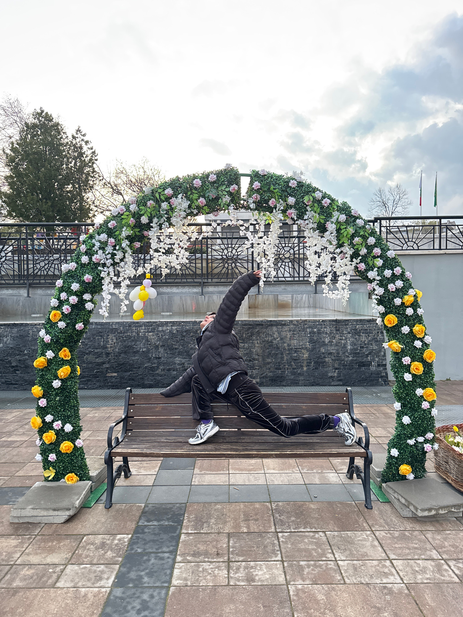 A person in a black jacket and black pants with a white stripe is sitting on a wooden bench. The person's right leg is extended and placed on the far end of the bench, while their left leg is tucked u…read more