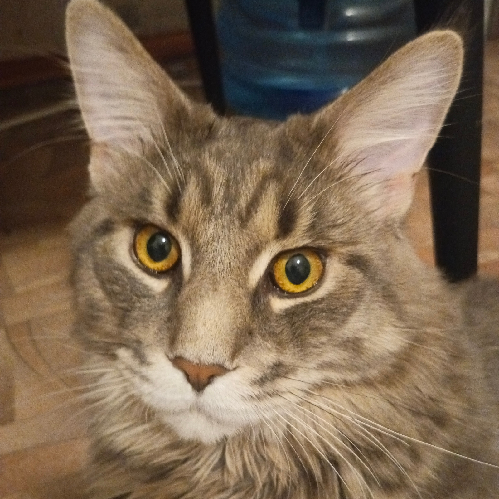 A close-up of a gray tabby cat's face. The cat has prominent, upright ears, golden eyes, and long white whiskers. The background is blurred, revealing a dark, indistinct area above the cat's head and…read more