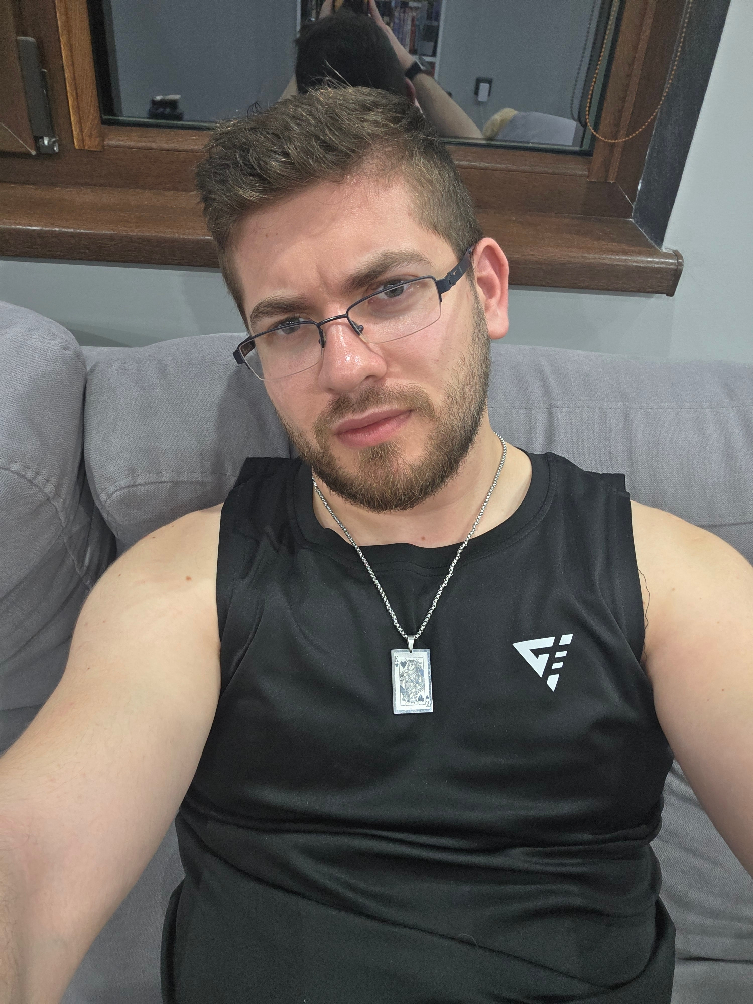 A man with a beard and glasses is lying on a gray couch. He is wearing a black tank top with a white logo on the left side and a silver chain with a pendant of a playing card, Queen of Spades. The bac…read more