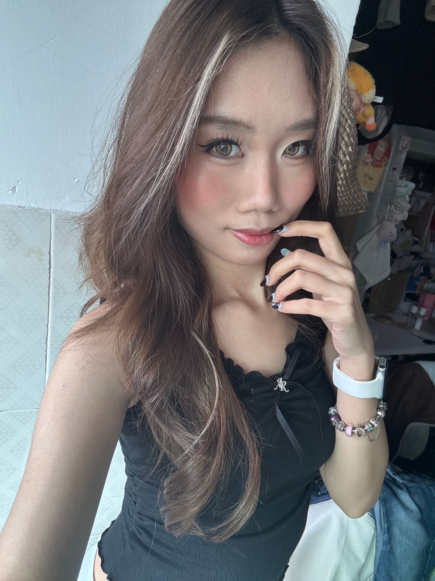 A selfie image, showing a young woman with long brown hair and fair skin. She is wearing a black top. A white smartwatch is on her left wrist, along with a bracelet. Her fingernails are painted dark w…read more