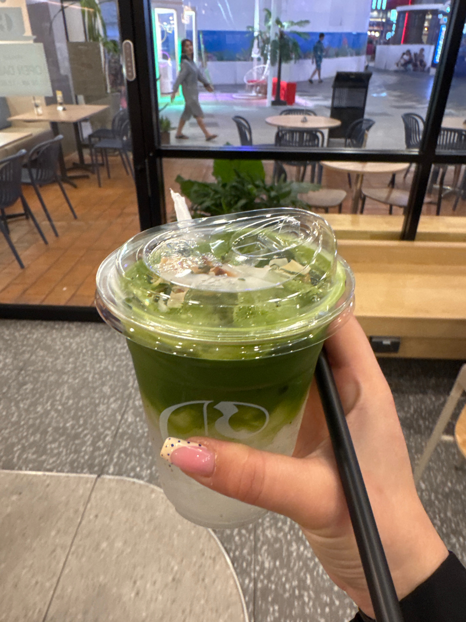 A close-up shot captures a hand holding a green beverage in a clear plastic cup with a lid and a black straw. The hand's nail is adorned with a pink and white tip pattern. The background, seen through…read more