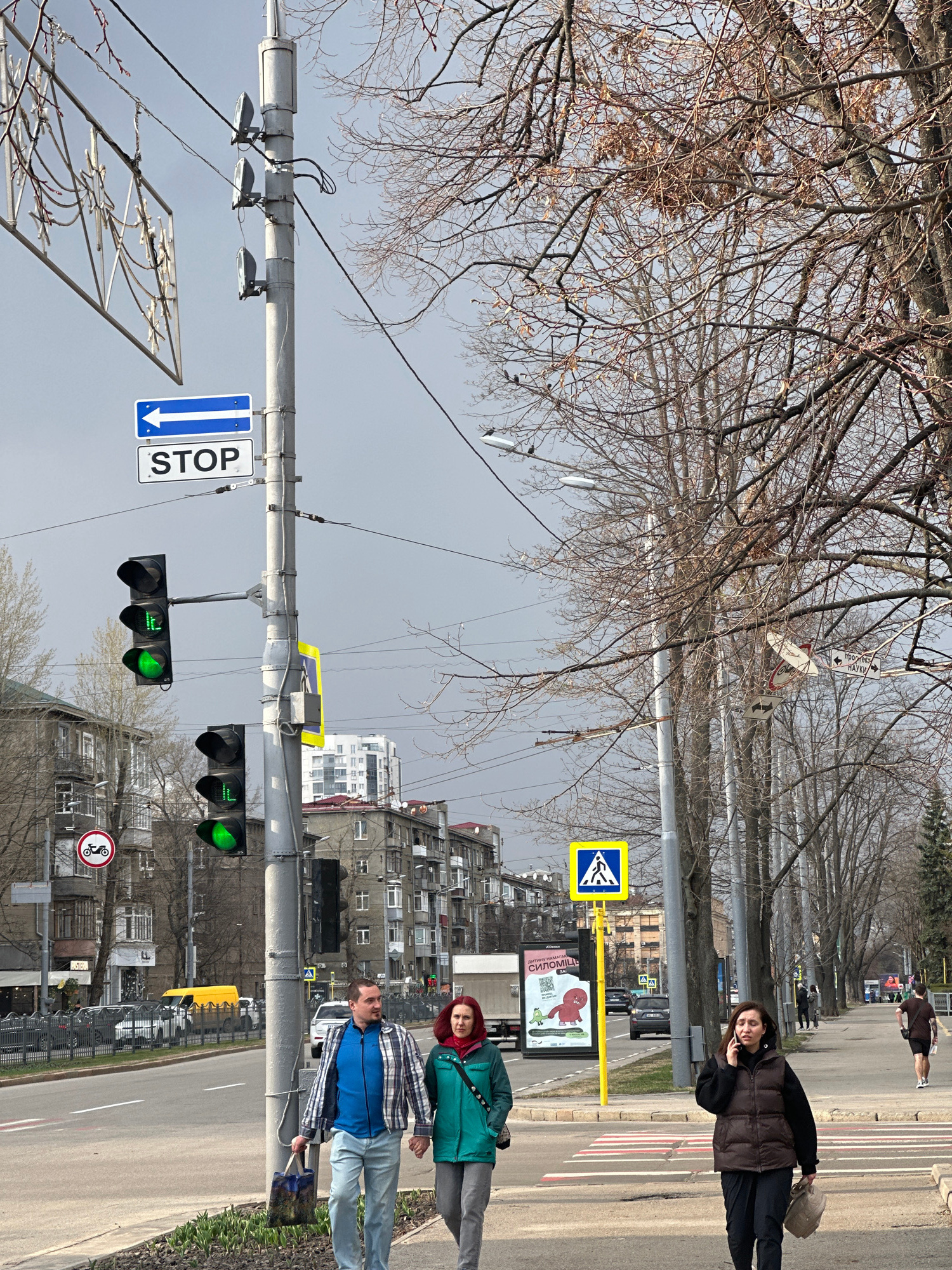 The image depicts a street scene in Kharkiv, Ukraine. A gray overcast sky provides the ambient light for the scene. In the foreground, a traffic light pole is visible, equipped with green traffic lig…read more