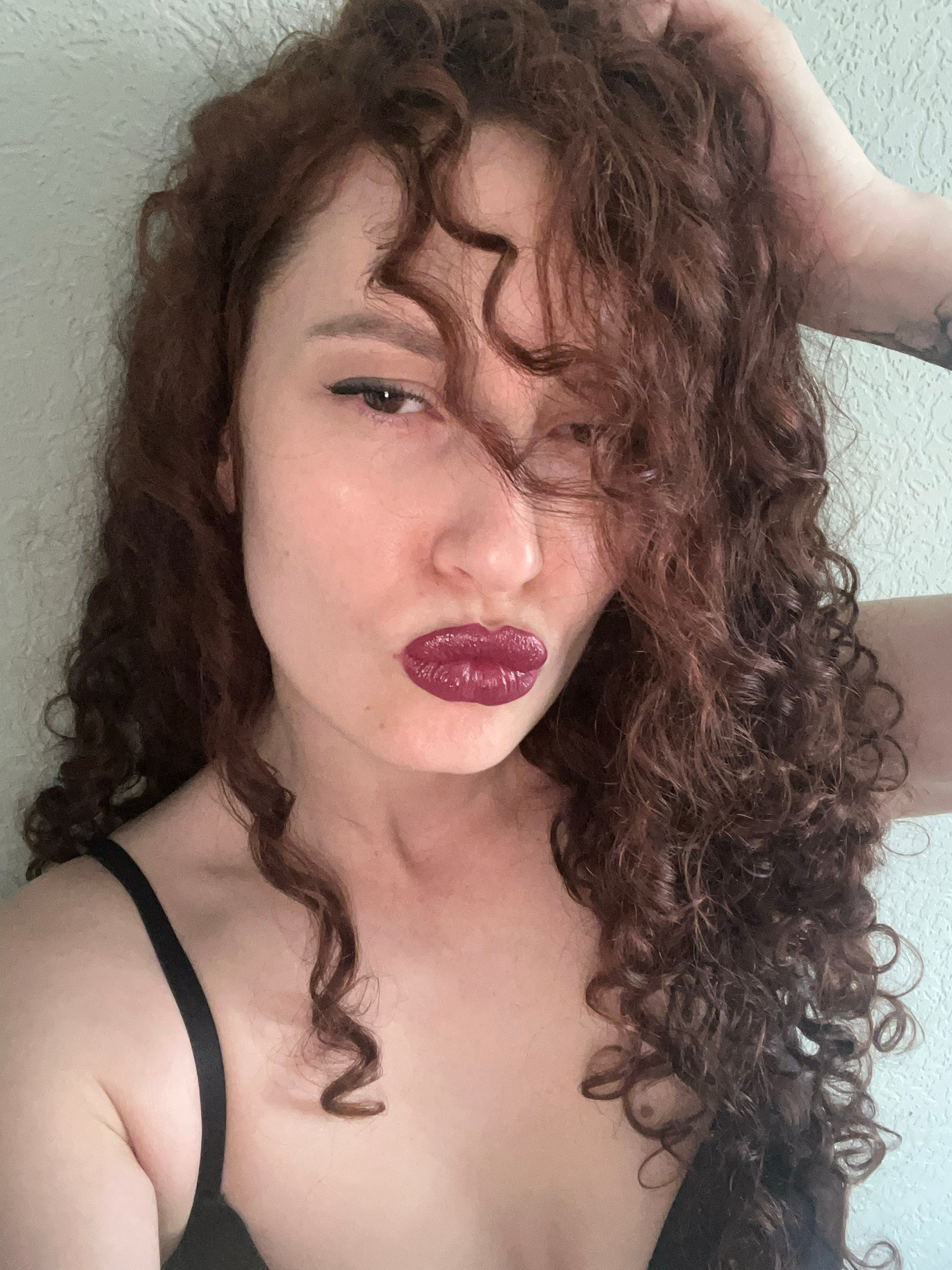 A woman with curly brown hair is lying down, facing the camera. She is wearing a dark lipstick and a black strap is visible on her shoulder. The background is a textured wall. The image does not proviβ¦read more