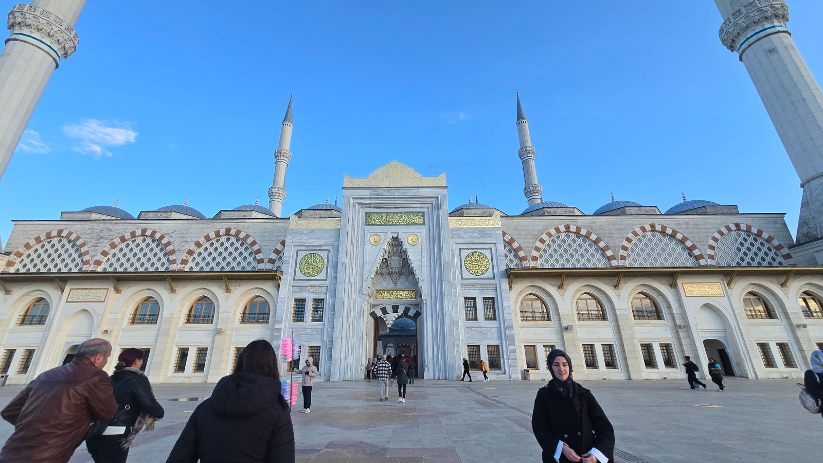 The image captures a sunny day in Üsküdar, Turkey, in front of the Çamlıca Mosque. The imposing structure of the mosque features minarets, domes, and a grand entrance adorned with Islamic calligraphy…read more