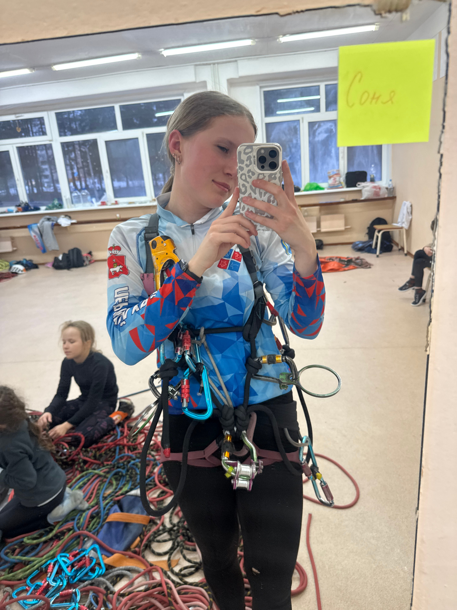 A young woman takes a selfie in front of a mirror. She is wearing climbing gear, including a harness and carabiners. In the mirror, a yellow sticky note with the name "Соня" (Sonya) written in Russian…read more