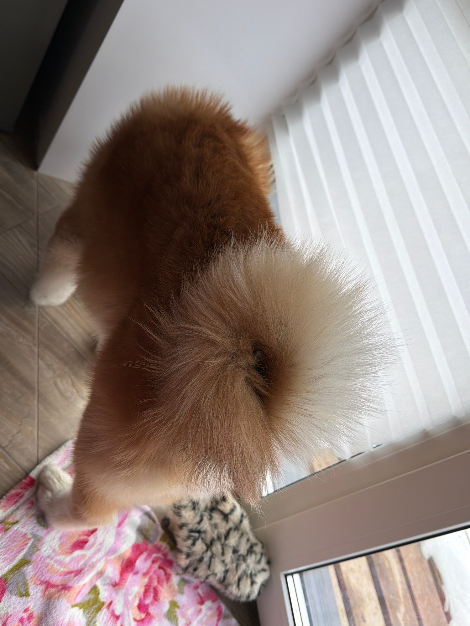 The image shows the hindquarters of a light-brown, fluffy dog standing on a tiled floor near a window. The dog's tail is particularly prominent, a large, fluffy mass of light-brown and cream fur. The…read more