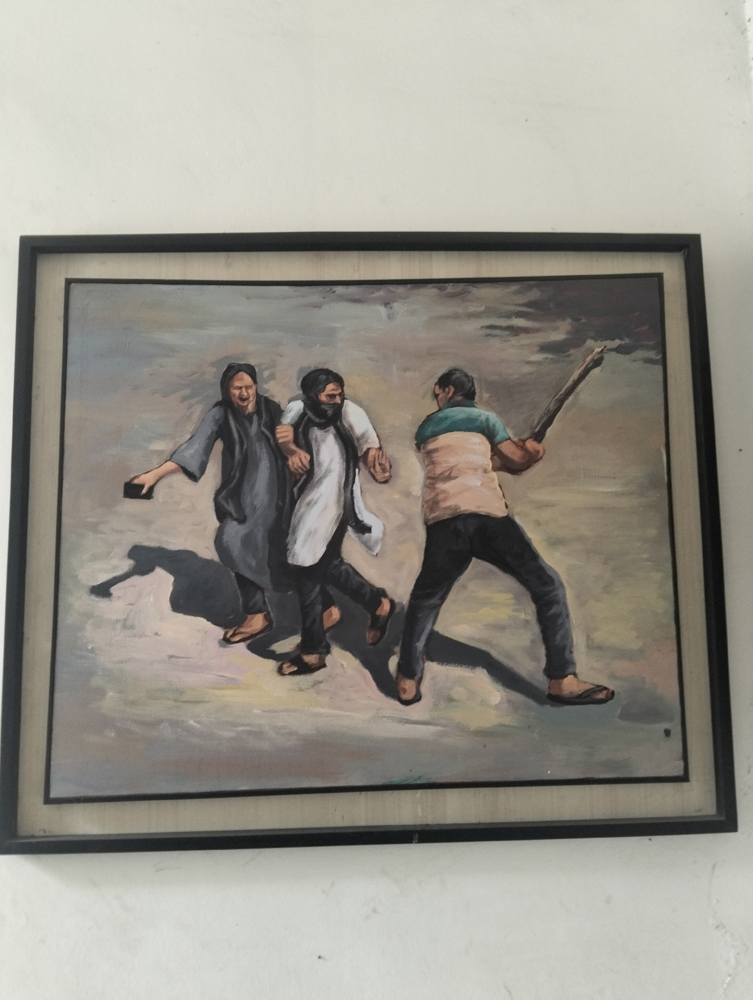 The image is a framed painting depicting a scene of violence. Two people are being pursued by another person wielding a club or stick. The person being pursued on the left is holding a dark, rectangul…read more