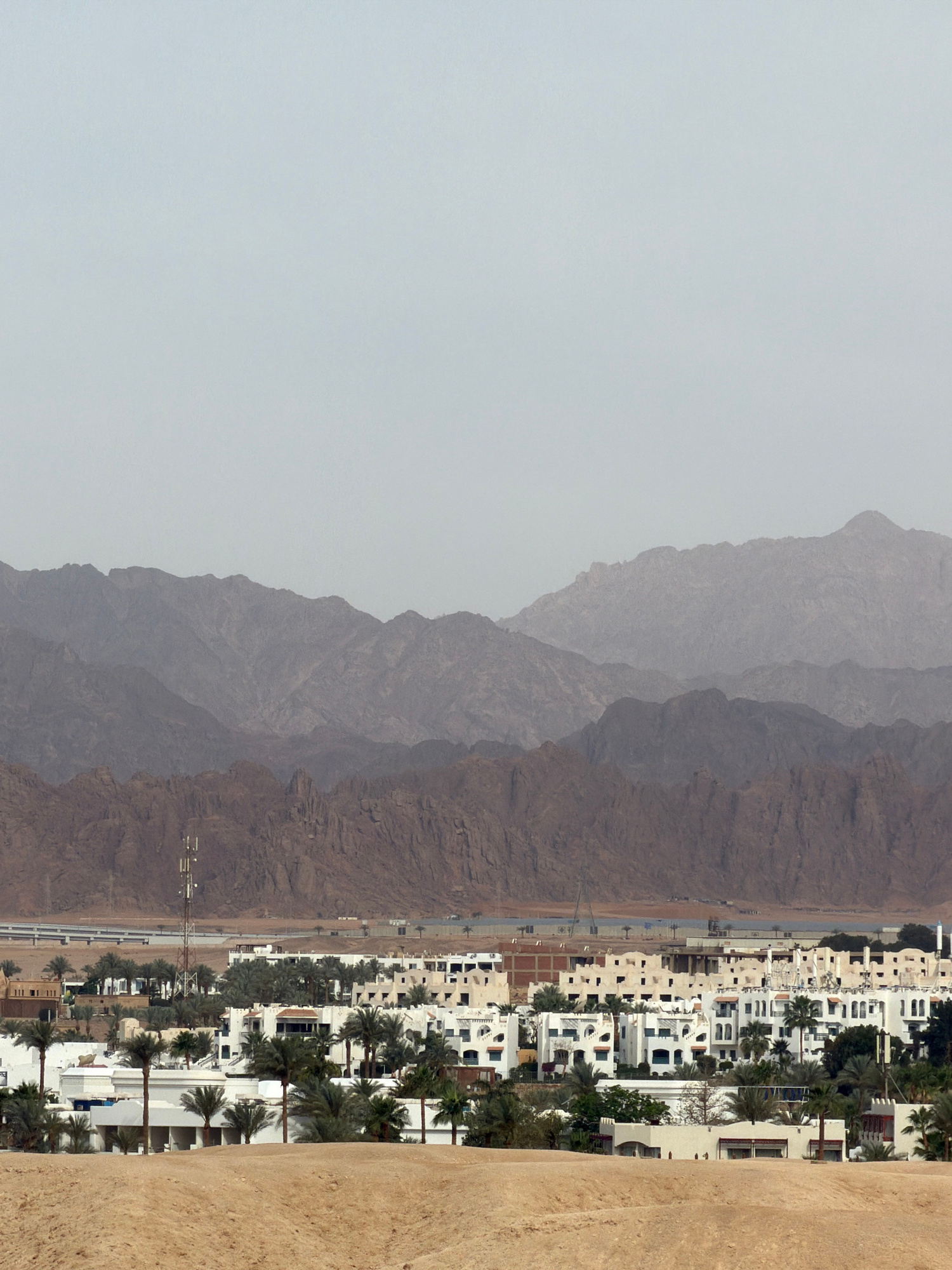 The image depicts a sideways view of a landscape near Sharm El Sheikh, Egypt. On the left are mountains fading into a hazy, light gray sky. To the right, the mountains transition into a flat area withβ¦read more