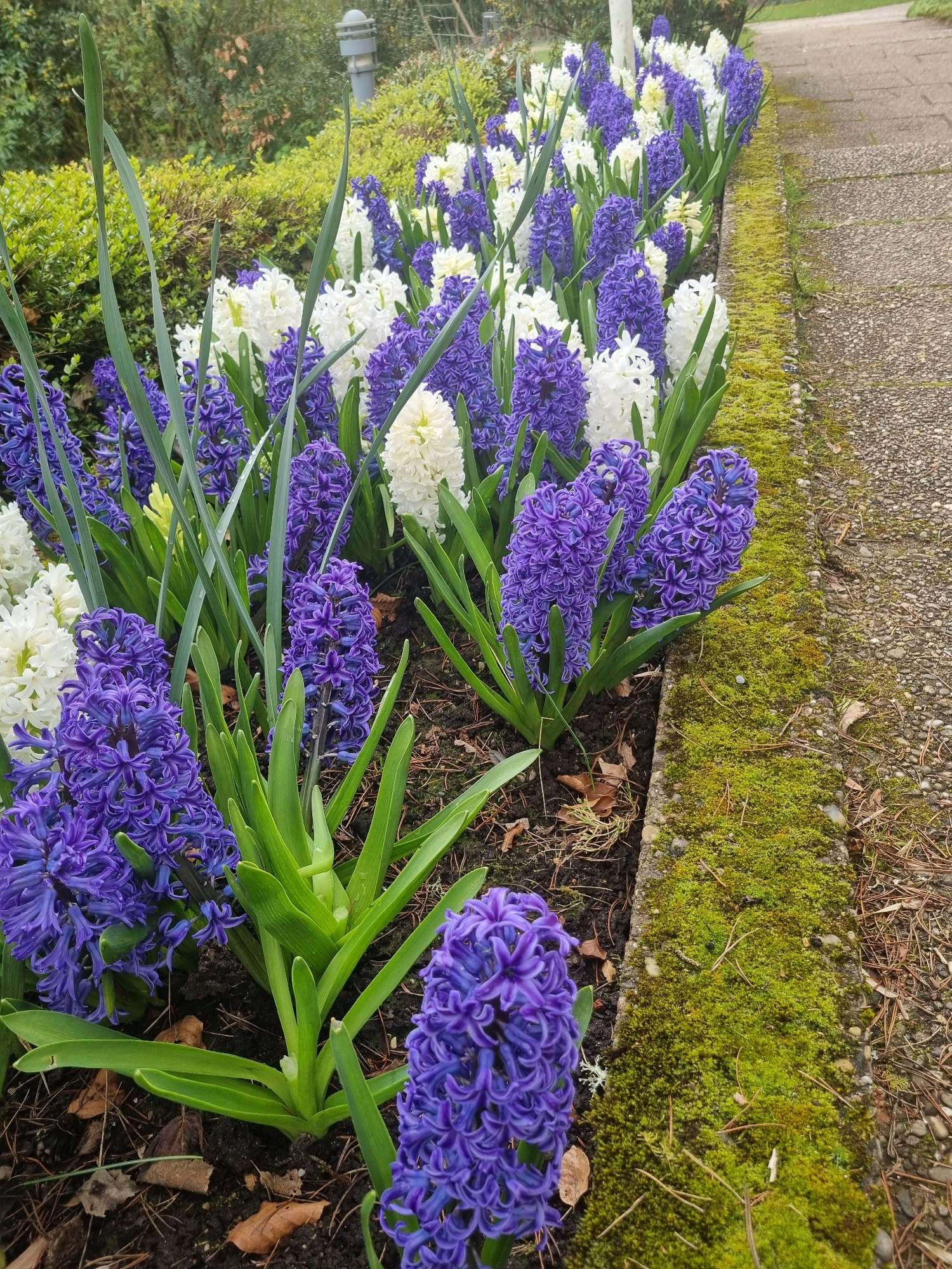 A row of vibrant hyacinth flowers, alternating between deep purple and pure white, stretches along the edge of a concrete path in Saarbrücken, Germany. Lush green leaves surround the flowers, compleme…read more