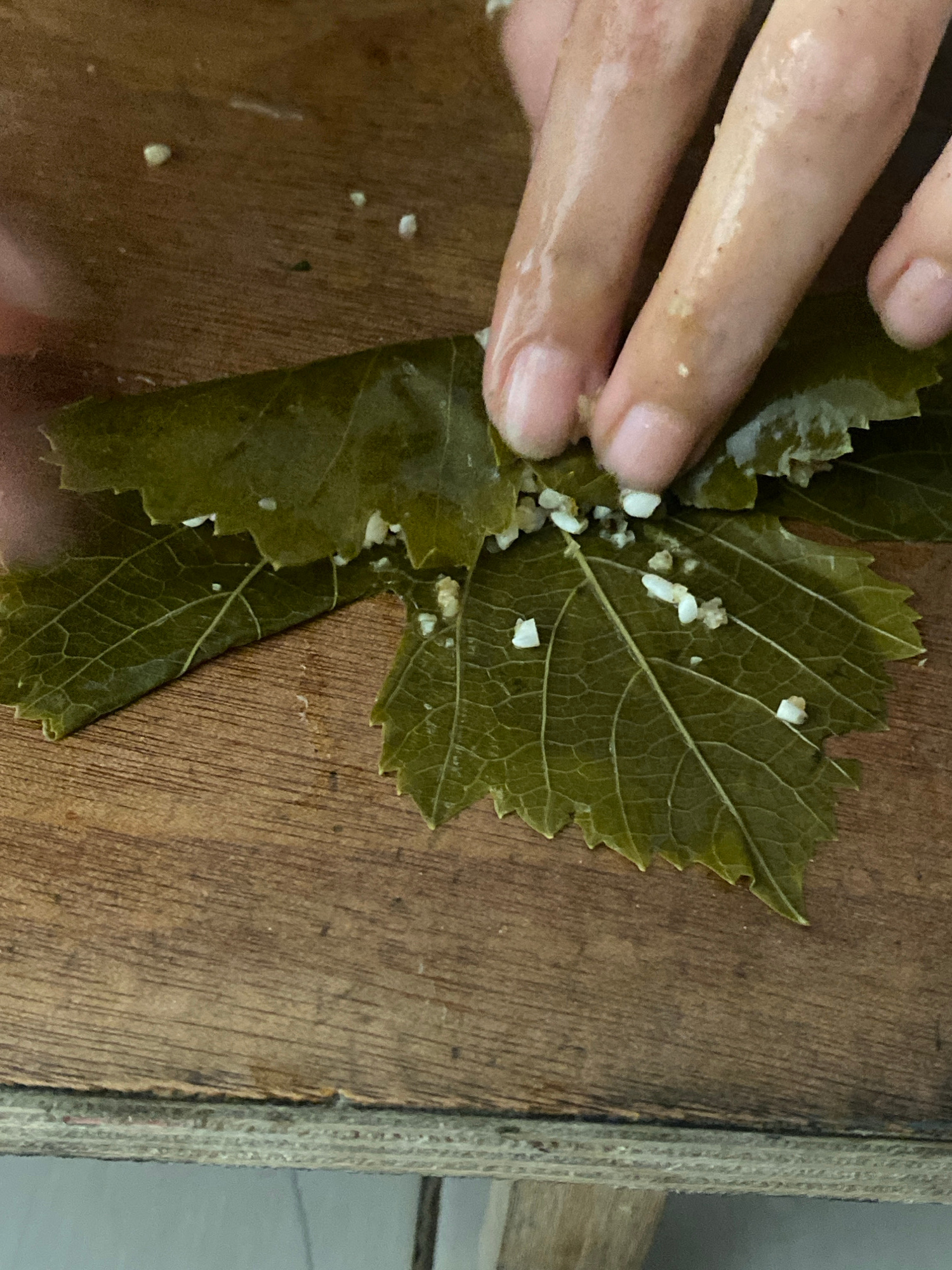A hand is placing a white substance onto a green leaf with a network of veins, set on a wooden surface. The scene is indoors. There is no verifiable location in Khan Yunis, Palestinian Territory.