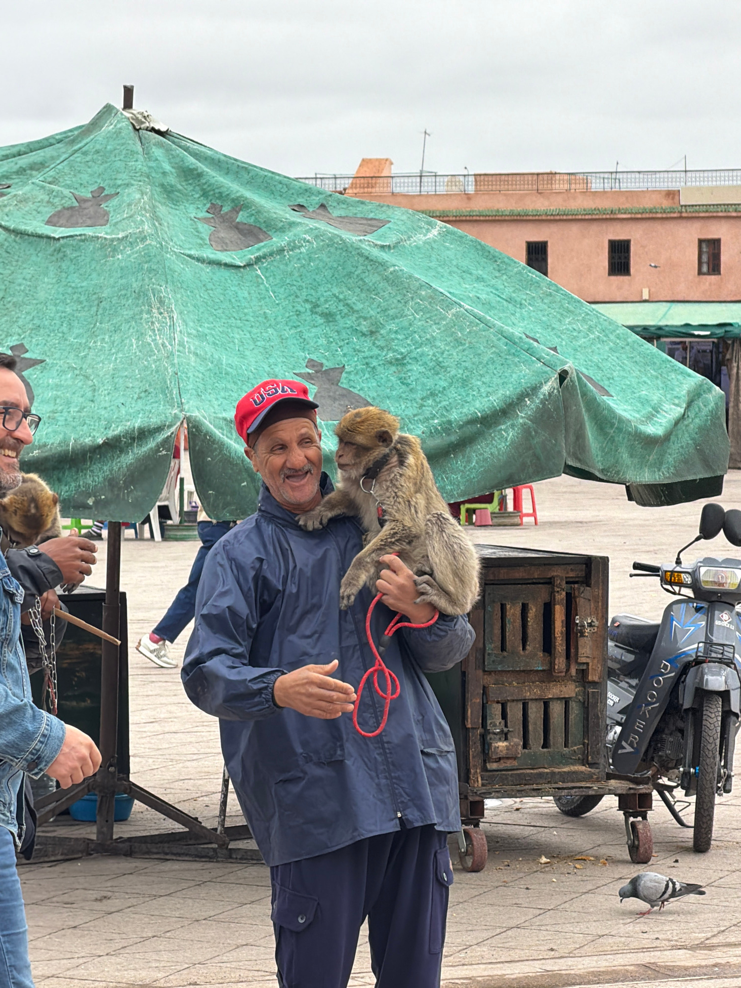 The image shows a scene in Marrakesh, Morocco. A man with a red "USA" baseball cap smiles at the camera with a monkey perched on his shoulder. He wears a dark blue jacket and darker blue trousers. In…read more