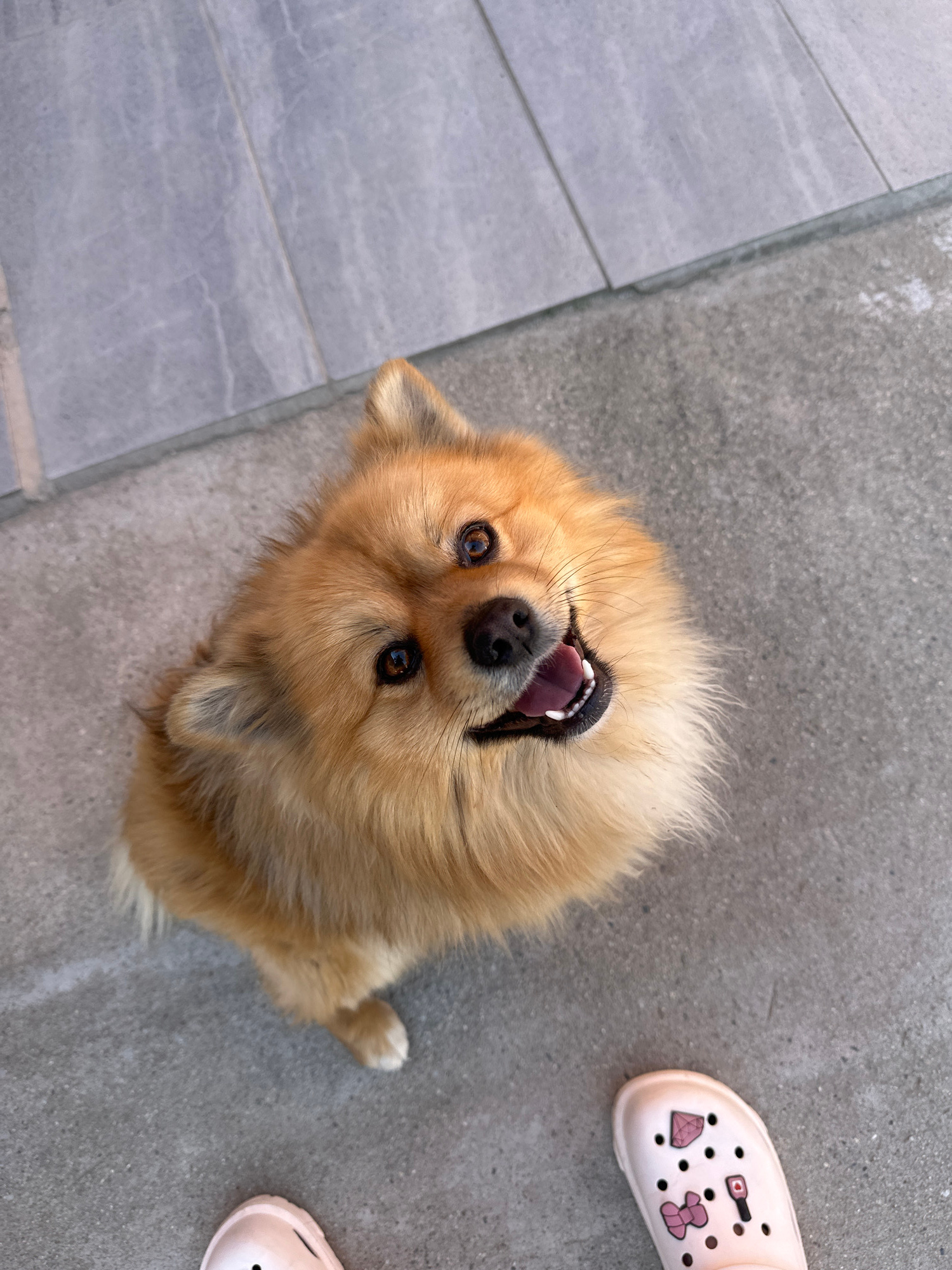 A Pomeranian-like dog with golden fur is sitting on grey concrete. The dog is looking up at the camera and smiling. The dog's tongue is visible. The location is possibly outside in a yard or patio. A…read more