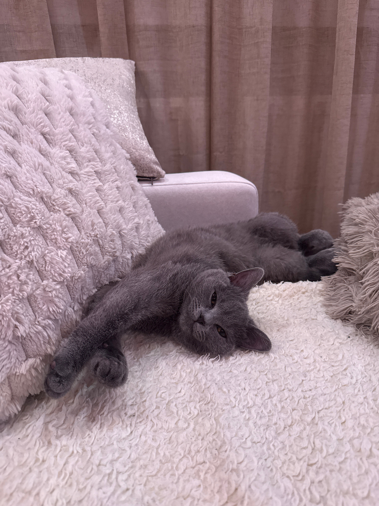 A grey cat is lying on a white, textured pillow, with its head resting on a fuzzy, off-white surface. The cat's body is stretched out, with its hind legs extended upwards and its front paws crossed. A…read more