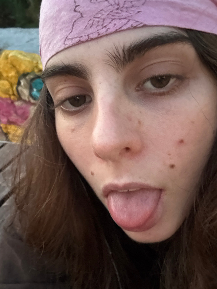 A close-up portrait features an individual with fair skin, long dark brown hair, and prominent dark eyebrows, looking directly at the viewer with open brown eyes. The person is wearing a light pink ba…read more