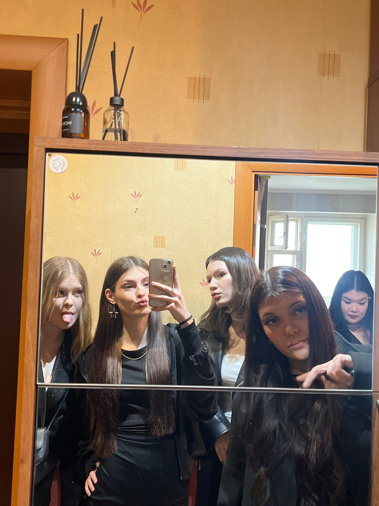 A group selfie of four young women or girls is captured in a large, vertically oriented mirror with a light wooden frame, taken in Vsevolozhsk, Russia. The image is presented as if rotated 90 degrees…read more