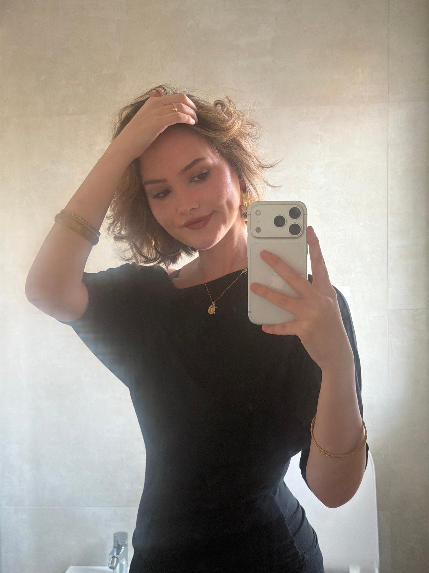 A woman is taking a selfie in a bathroom. She is holding a white smartphone with three camera lenses. She is wearing a black dress and gold jewelry including a necklace, ring, and bracelets. Her hair…read more