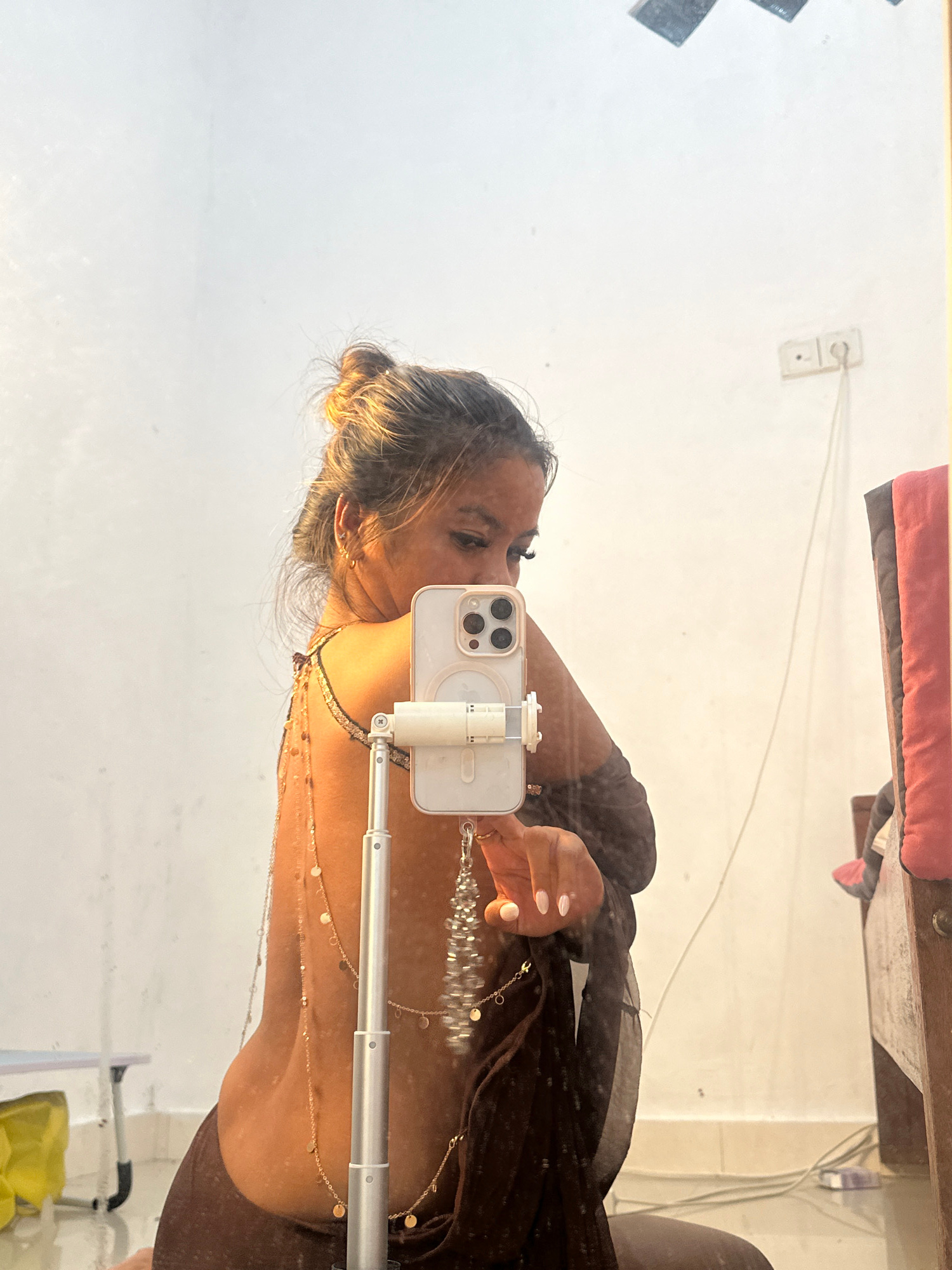 A selfie of a woman in a mirror reflection in Celuk, Indonesia. She holds a white iPhone with a tripod stand, obscuring part of her face. She wears a brown top and multiple layered necklaces. Her hair…read more