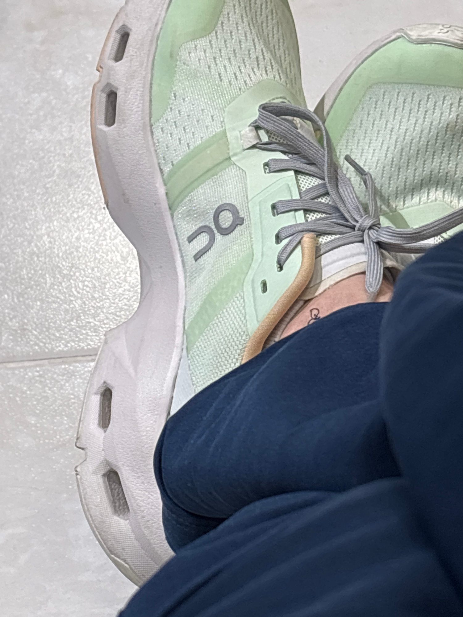The image shows a close-up view of a person wearing a light green On brand running shoe. The shoe has gray laces, a white sole with cutouts, and the On logo is visible. Part of the person's ankle is v…read more