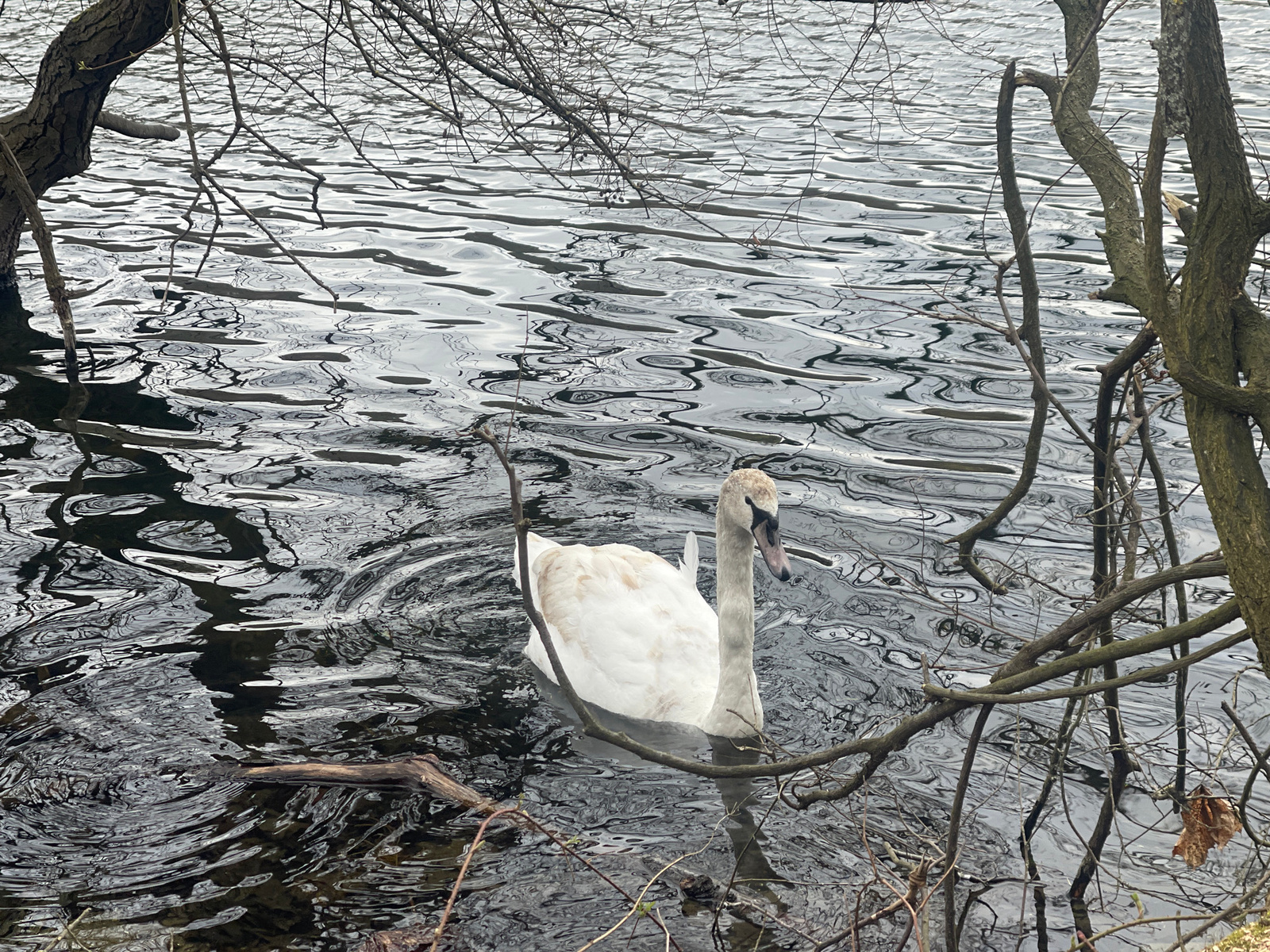 A juvenile mute swan swims in the dark water of a lake or pond. Branches and tree trunks surround the swan, framing it in the foreground and background. The water's surface is rippled, reflecting theβ¦read more