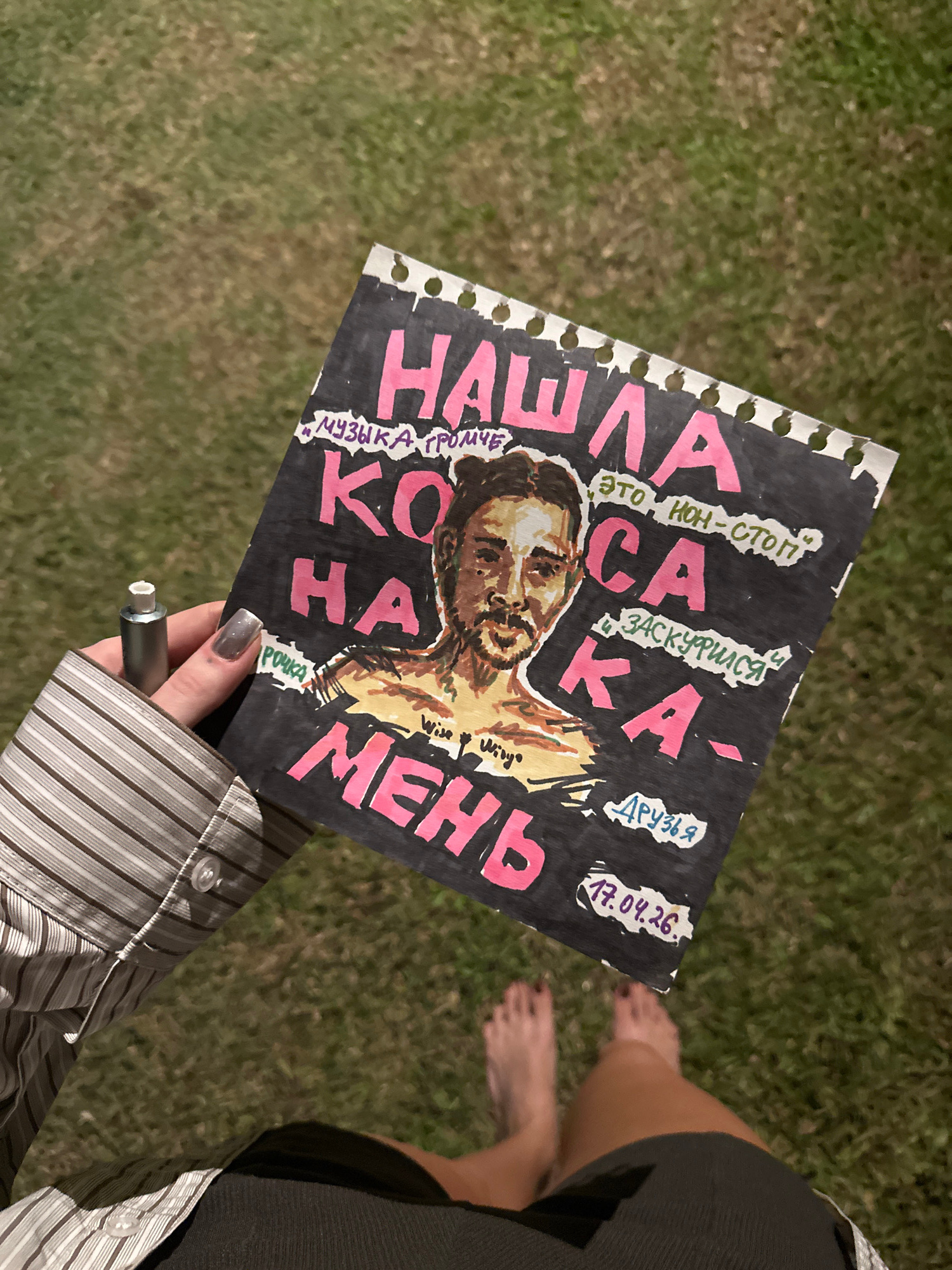 An overhead photograph shows a person holding a vibrant, hand-drawn artwork against a backdrop of green grass. The artwork, created on a piece of paper with torn, perforated edges, likely from a spira…read more