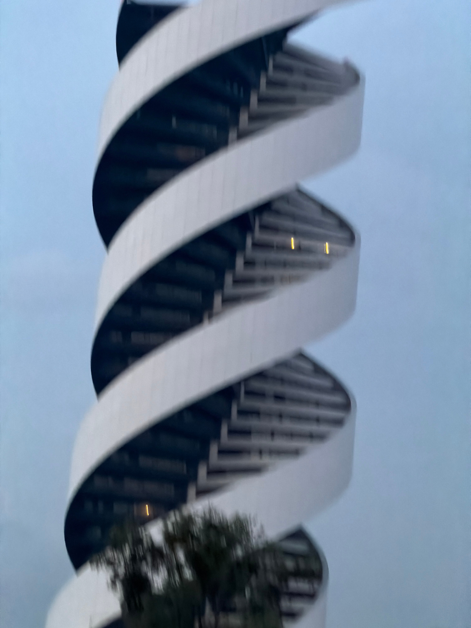 The image shows a partial, blurred view of a white, spiraling architectural structure in San Bernardino Tlaxcalancingo, Mexico. The structure appears to be modern, with repetitive arched or coiled ele…read more