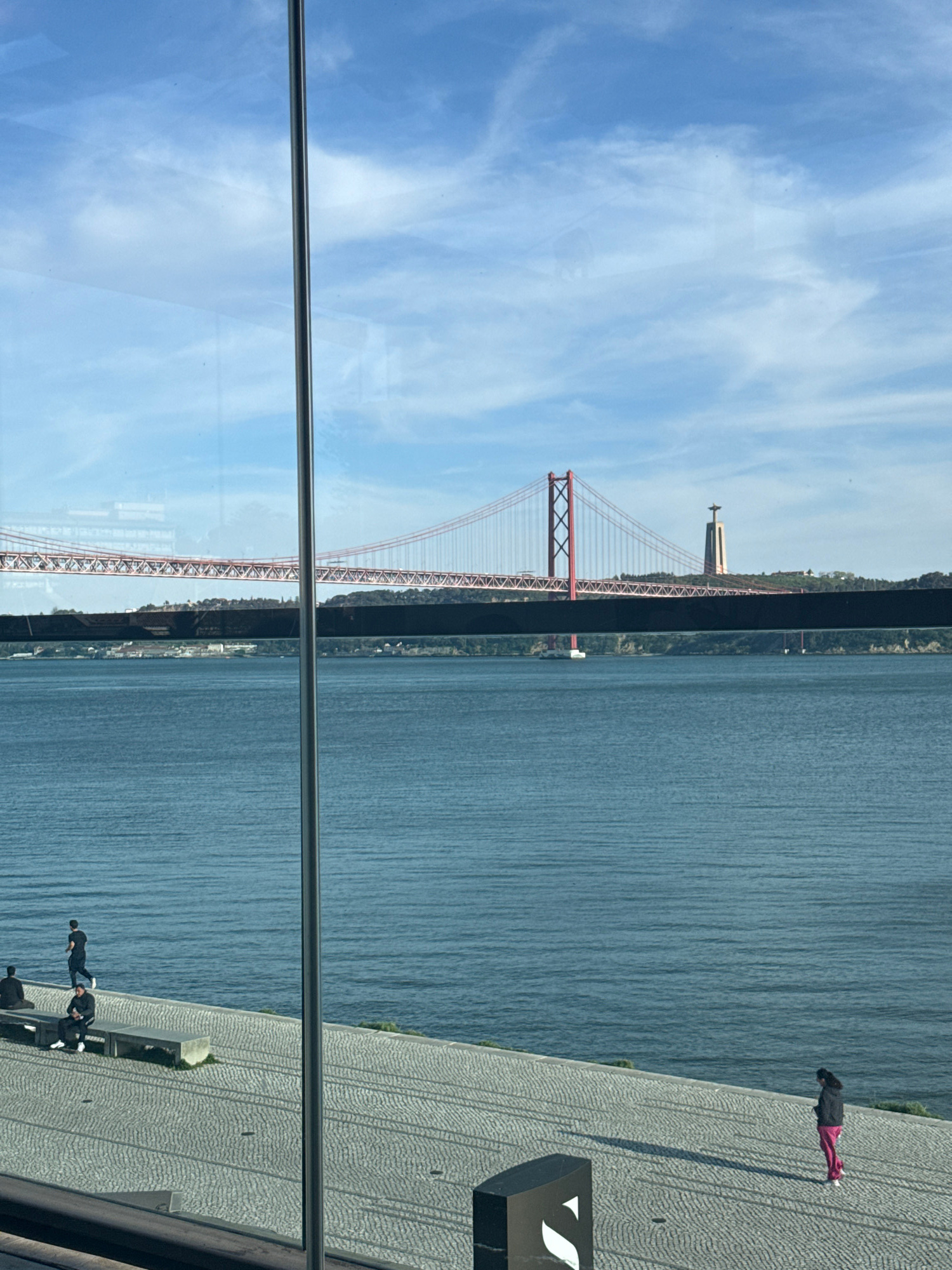 The image shows the Ponte 25 de Abril bridge in Lisbon, Portugal, seen through a glass panel. The bridge spans a body of water, with a coastline visible along its length. The sky is blue with scattered clouds. On the right side of the image, a paved area is visible with several people, including a person lying down. There is a modern-style bench or structure with a logo. A thin metal bar runs horizontally across the center of the frame, partially obscuring the view. | Open Wire