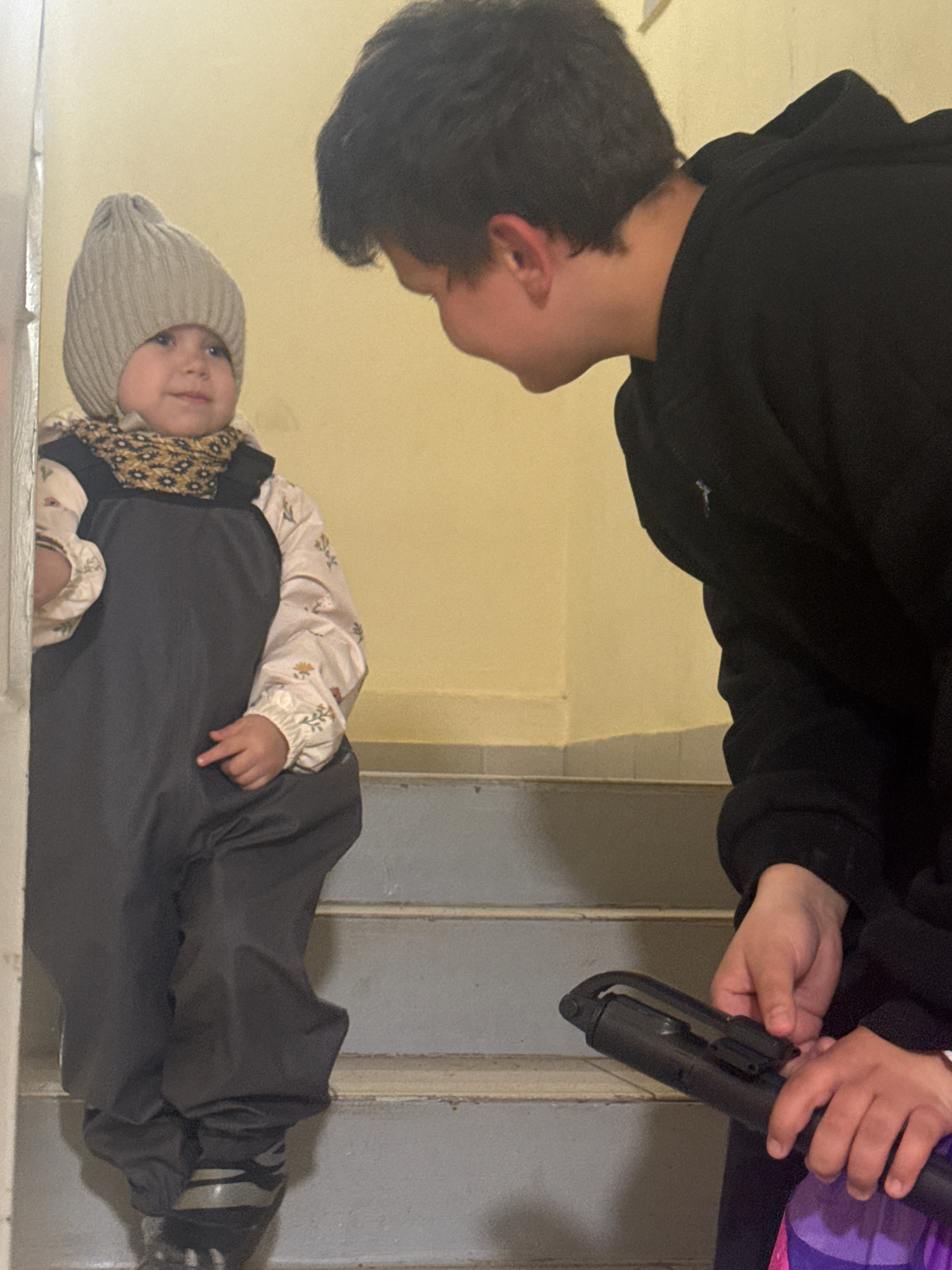 A child lies on their back wearing a grey knit hat, a floral print shirt, a patterned scarf, and dark grey overalls. A young person in a black hooded sweatshirt looks down at the child. A small pair o…read more