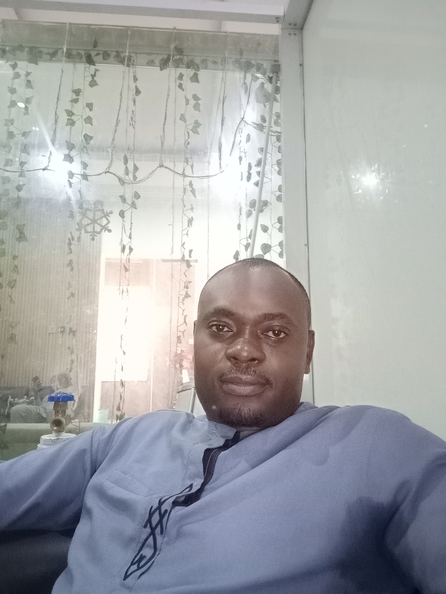 A medium close-up shot of a man with dark skin and a shaved head, centered in the frame. He is wearing a blue shirt with a dark accent design on the chest. The man is looking directly at the camera. Behind him, there's a window or partition with a decorative vine curtain. Outside the window, indistinct objects are visible. The location is presumed to be in Gwarinpa, Nigeria, based on external information not visible in the image itself. No further specific environmental details can be determined from this image. | Open Wire