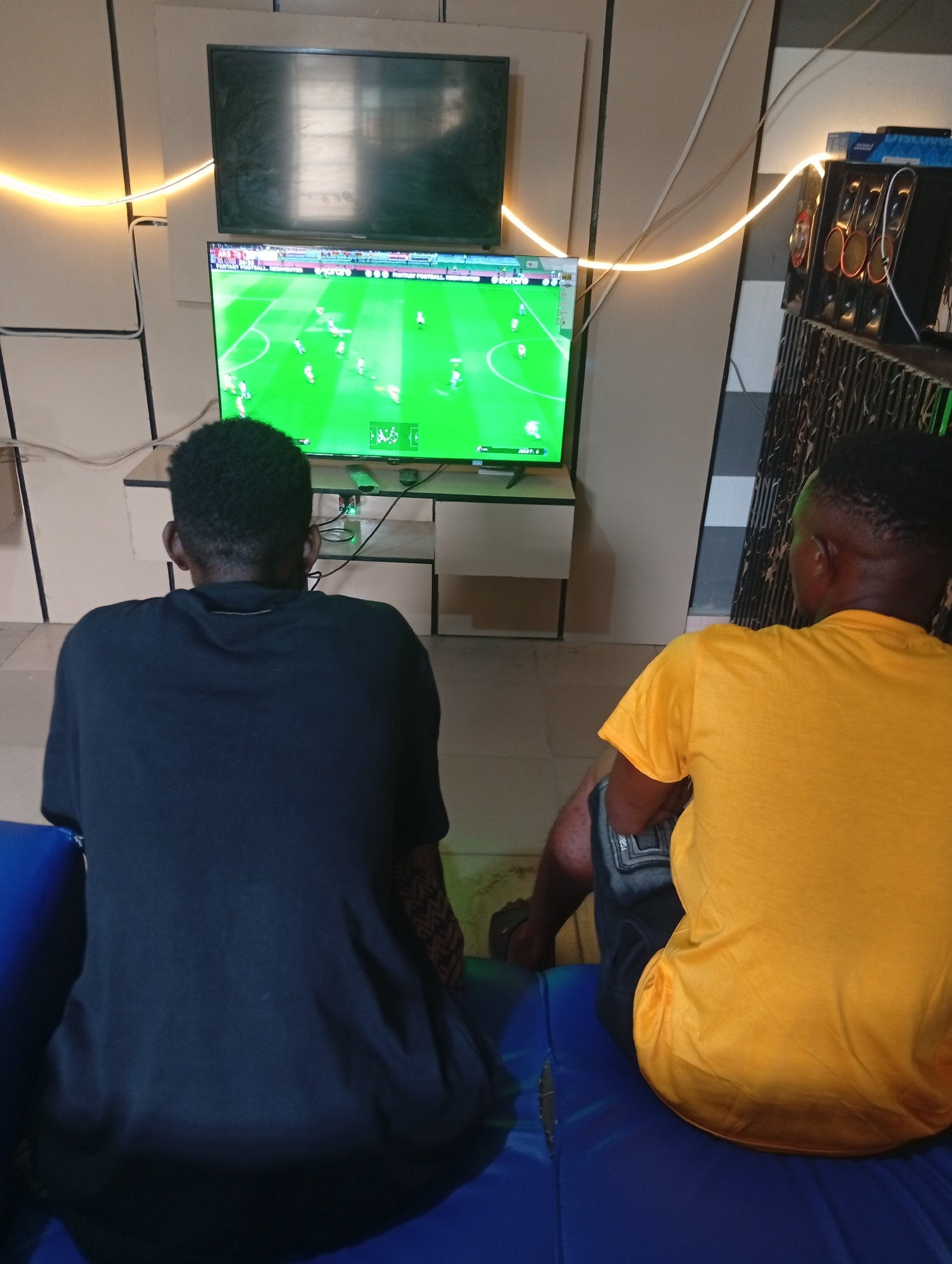 Two men are depicted from behind, deeply engaged in playing a soccer video game on a large television screen in an indoor setting in Adankolo, Nigeria. They are seated side-by-side on blue cushioned b…read more