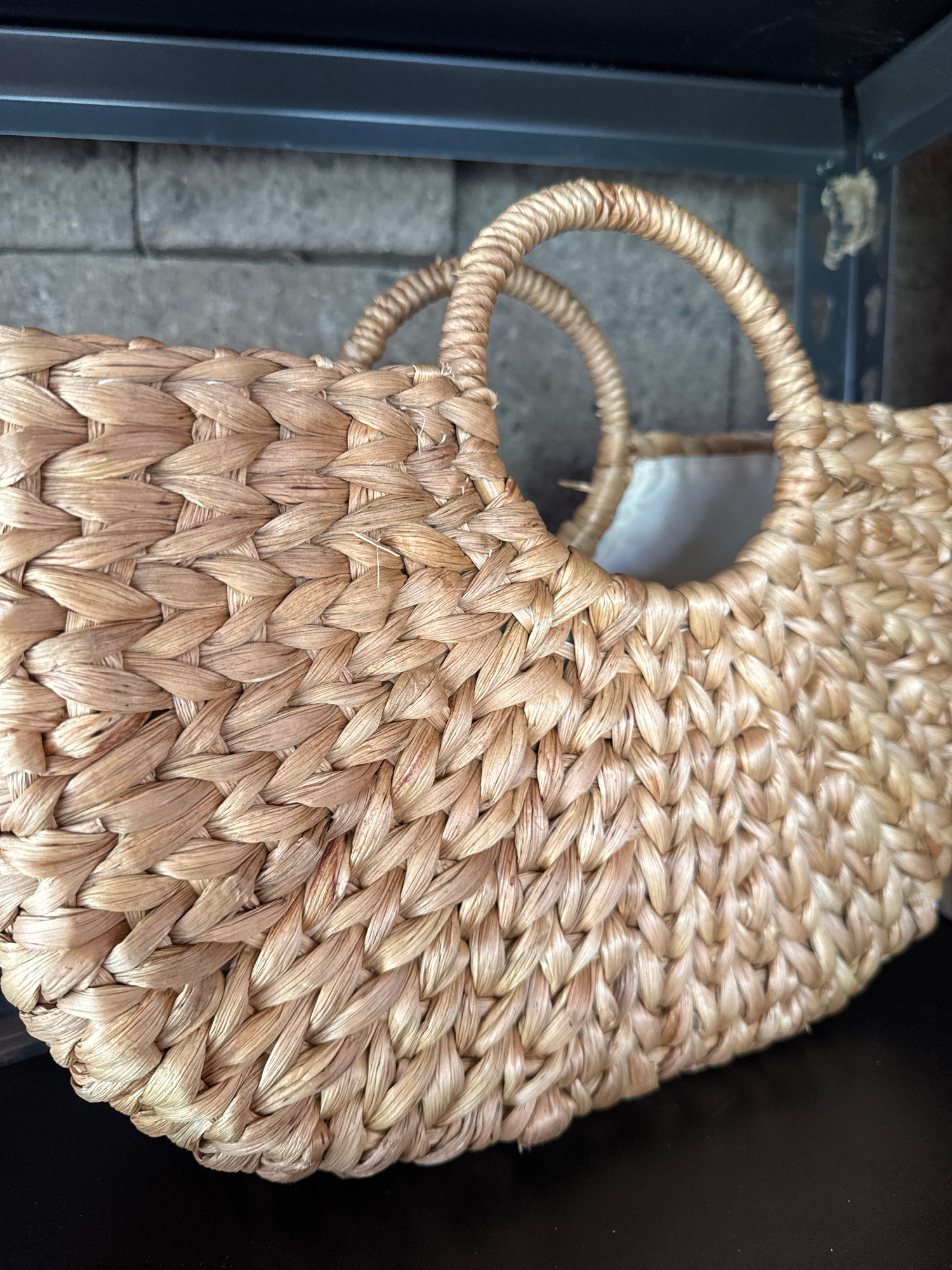 The image shows a tightly woven, light brown basket with two round handles. The basket appears to be resting indoors. The left edge of the frame includes a section of a dark-colored table or shelf wit…read more