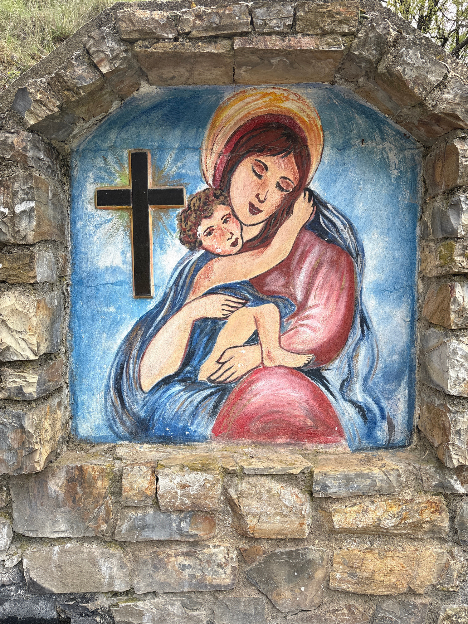 A religious painting within a stone-built niche depicts a stylized representation of Mary holding the baby Jesus. Mary has brown hair, tan skin, and a simple yellow halo; she is wearing a pink top and…read more