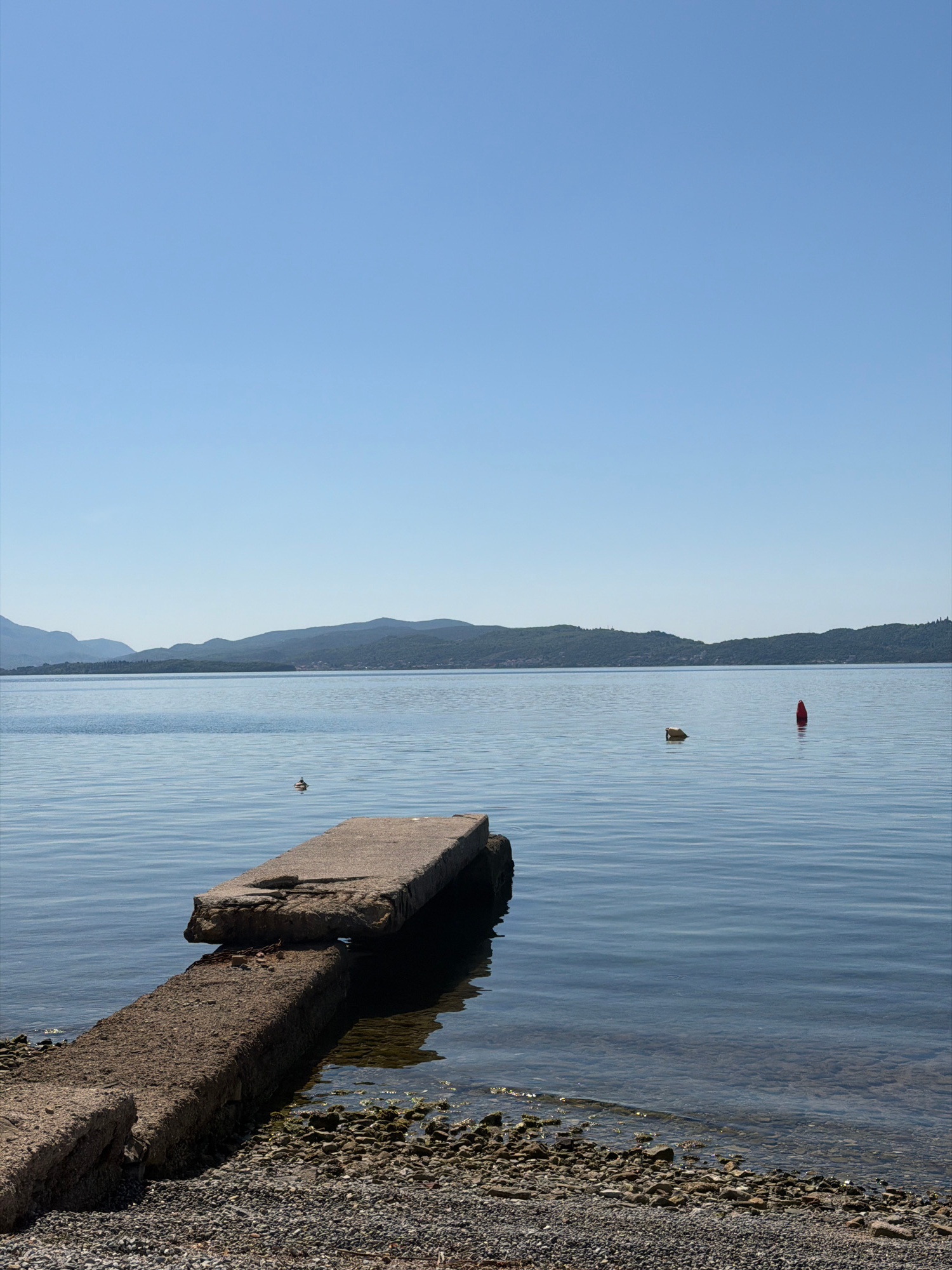 The image depicts a coastal scene in Bijela, Montenegro. The camera is positioned at the edge of the shoreline, looking towards the water. A weathered concrete structure extends into the water from thβ¦read more