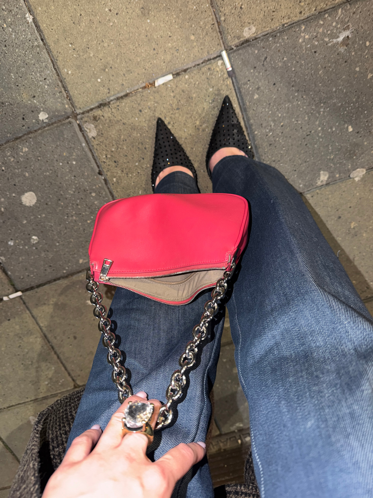 A top-down shot shows a person seated on a Belgrade, Serbia sidewalk. They are wearing dark-wash denim jeans and black, studded pointed-toe heels. A bright pink handbag with a silver chain strap rests…read more